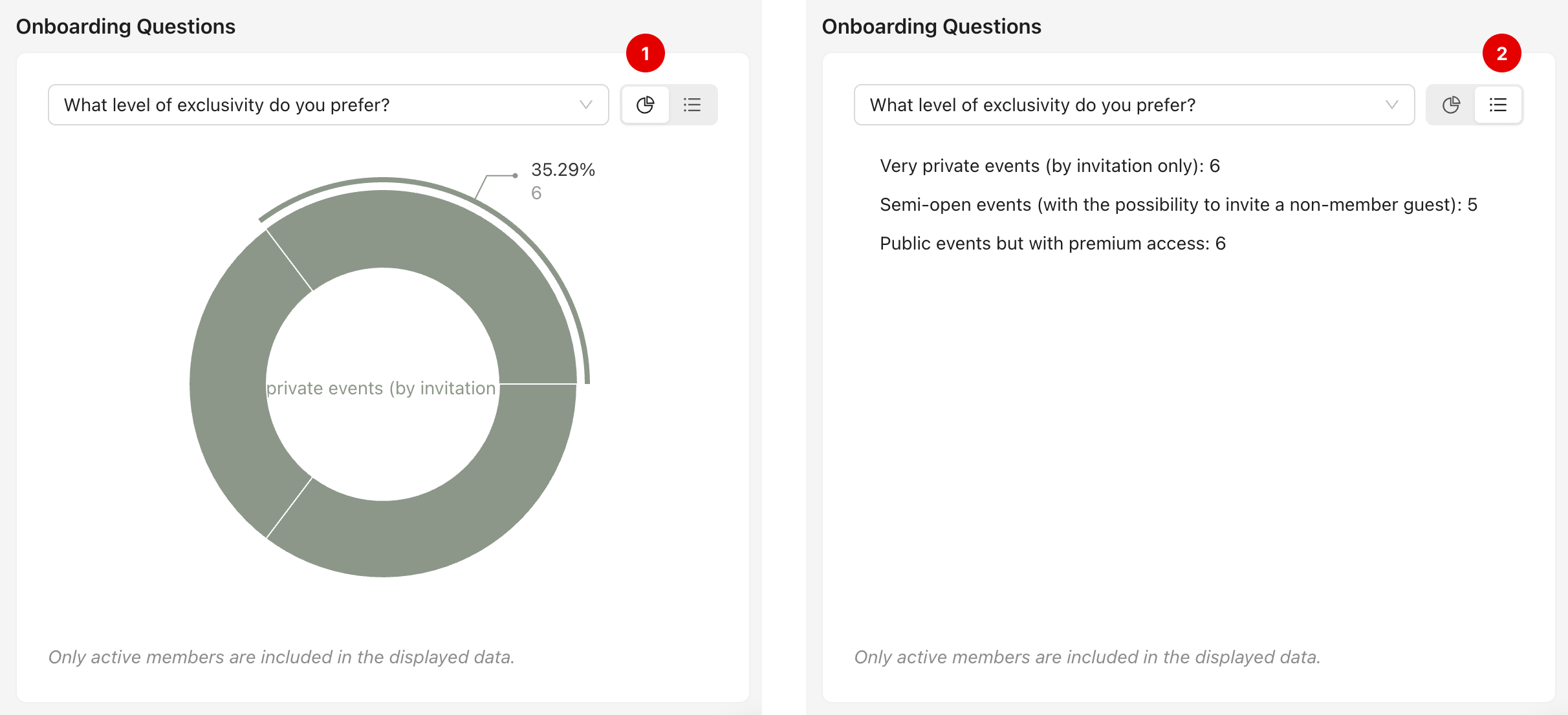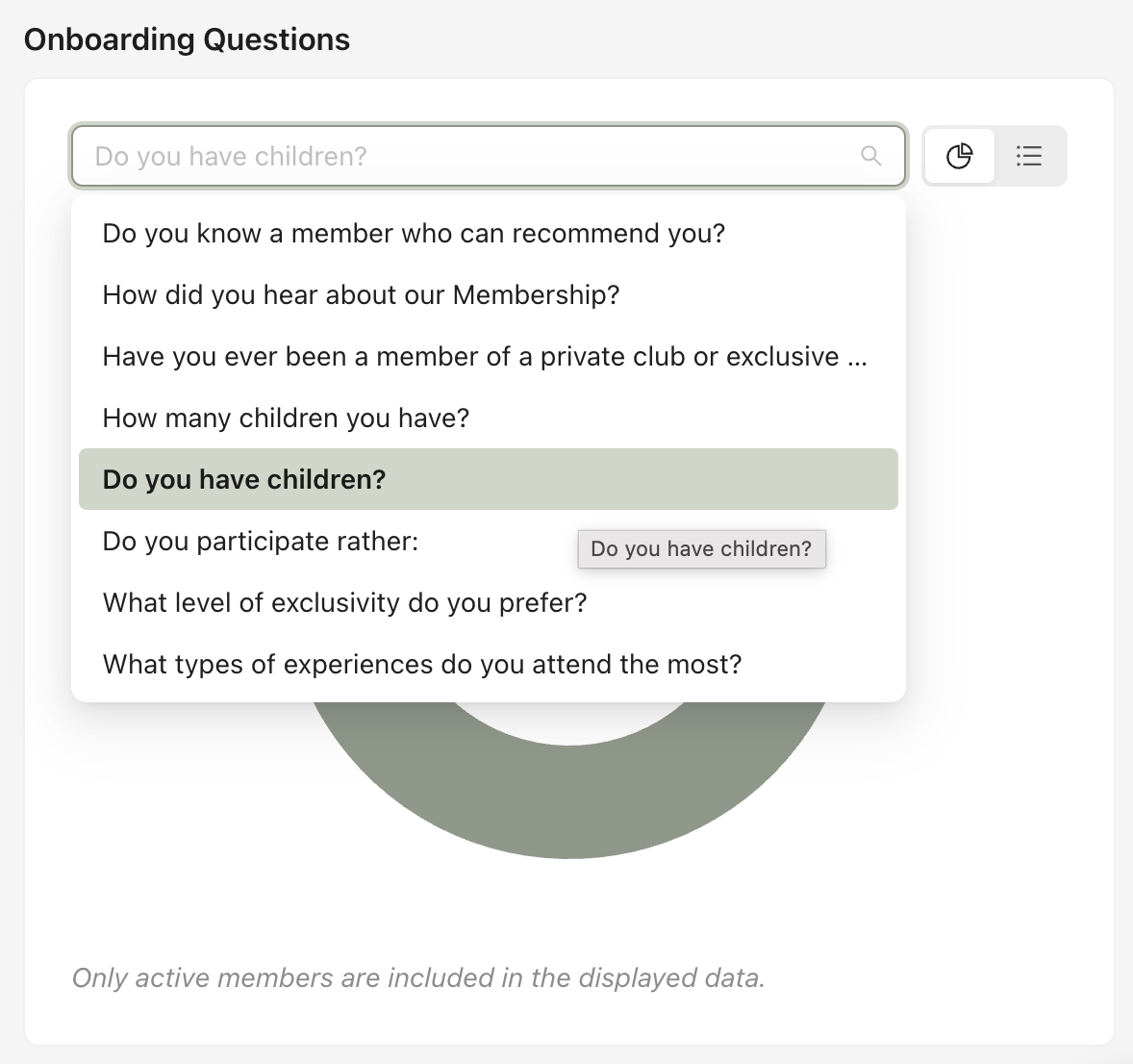 This section analyzes responses to onboarding form questions. You can select a specific question from the dropdown menu to view aggregated answers from active members (1).