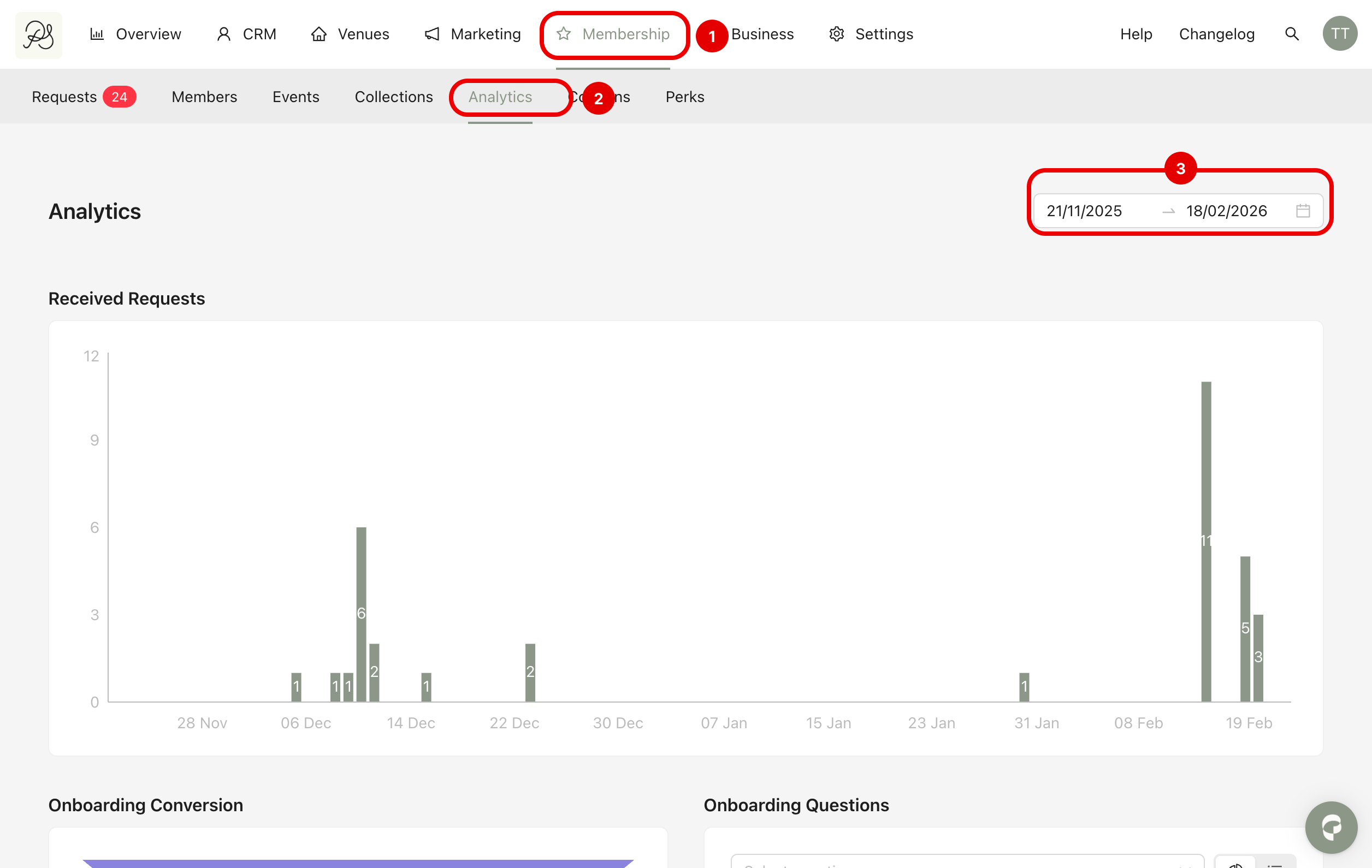 You will see three main analytics sections: Received Requests, Onboarding Conversion, and Onboarding Questions.