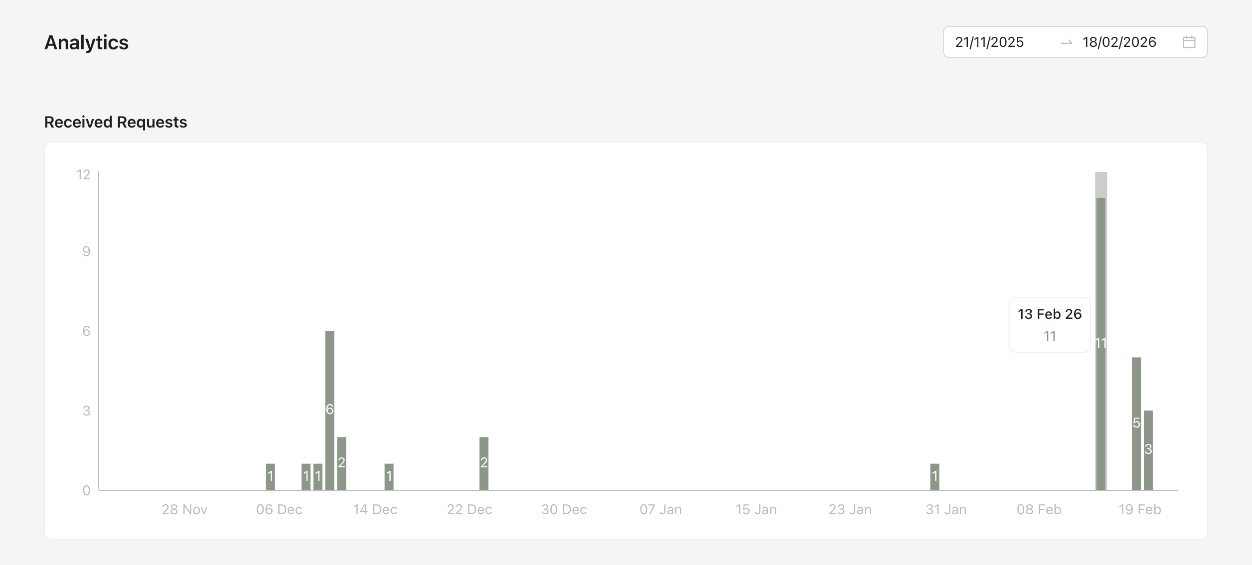 This section shows the number of membership requests received over time. The bar chart displays how many requests were submitted on each day within the selected date range.