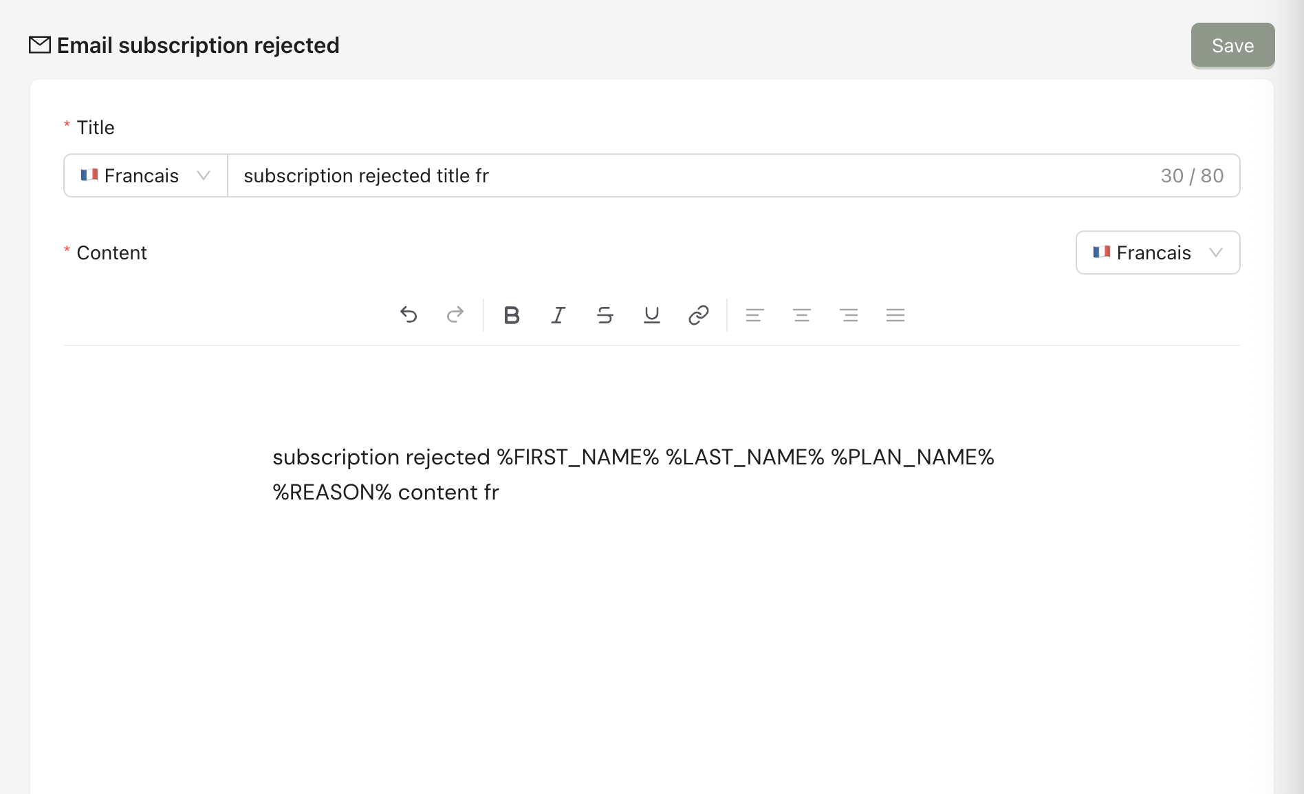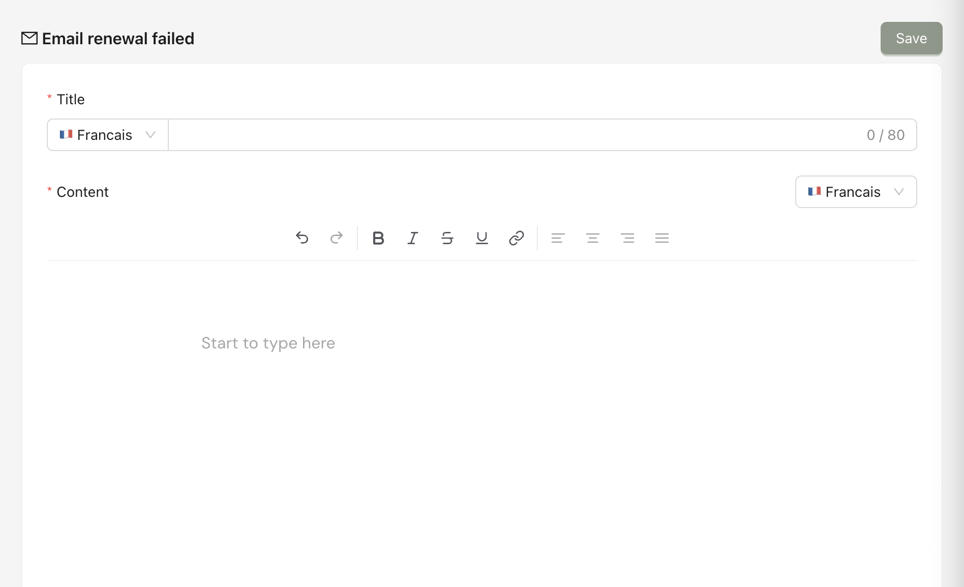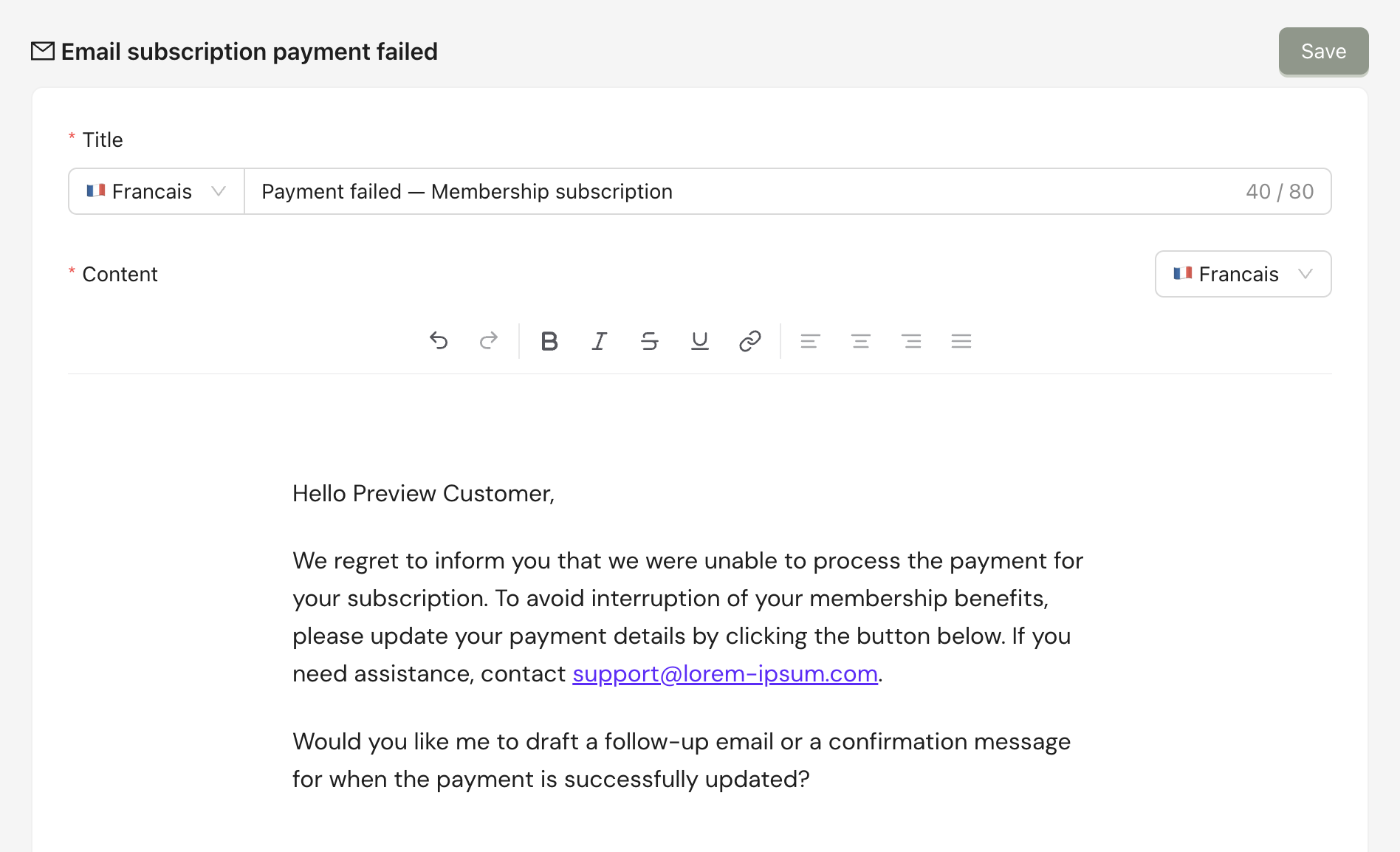 When the PSP tries to capture the payment at the renewal date and fails, it will be sent automatically to announce this to the client. You can use variables to customize it for each customer.