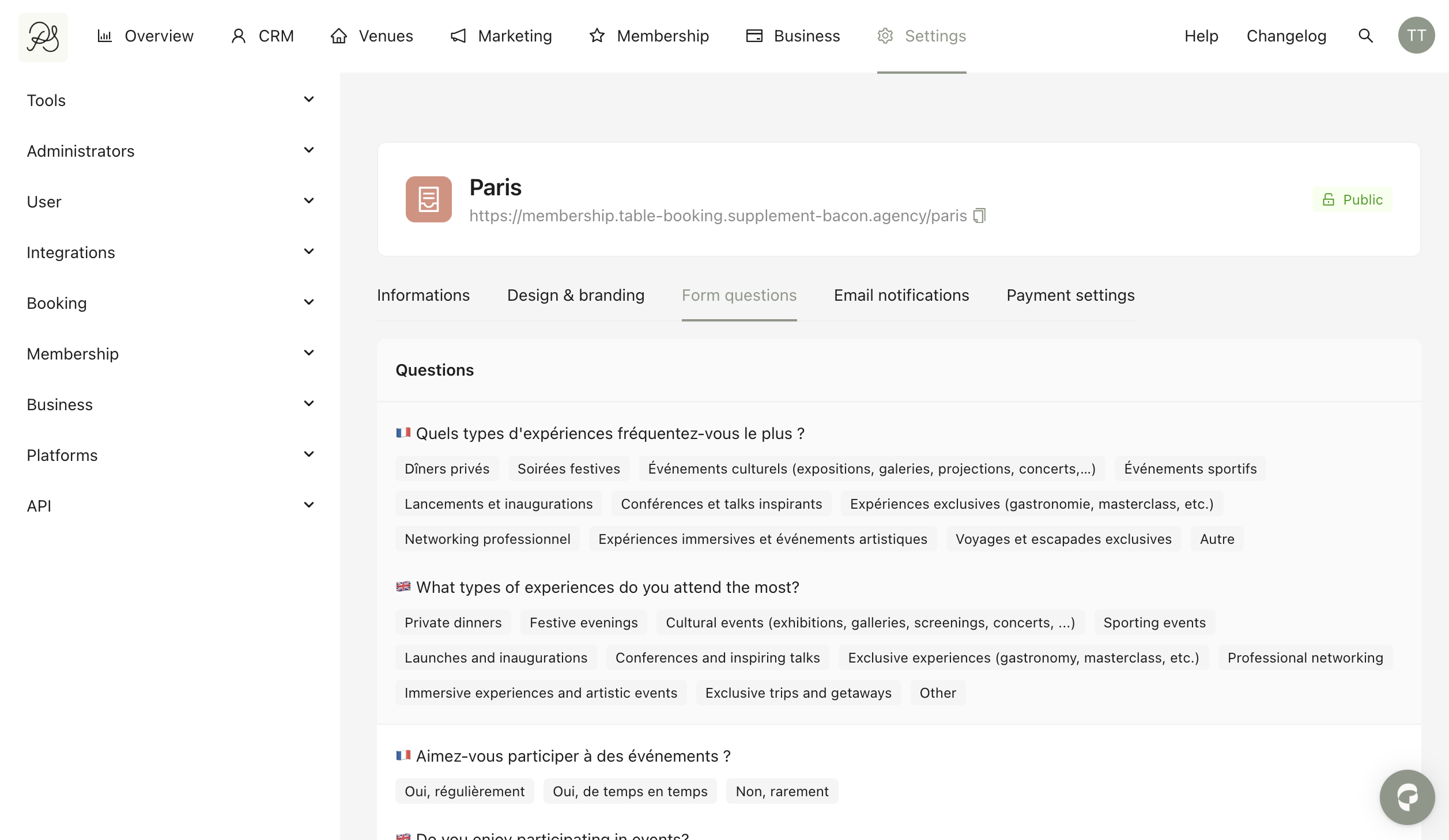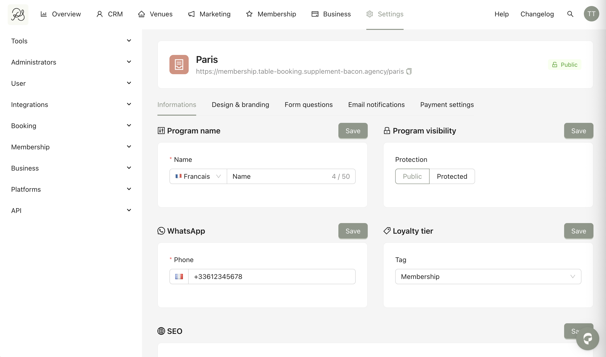Membership program can be viewed and managed from the dashboard. You can edit its main information, design, view form questions, email notifications, and payment settings.