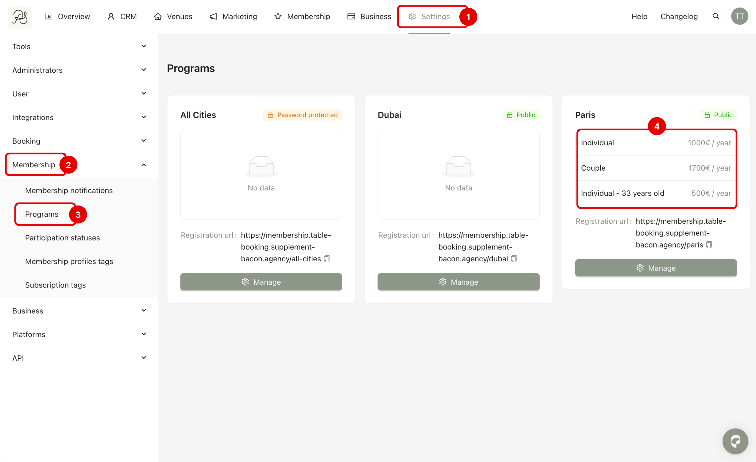 Go to Settings (1) → Memberships (2) → Programs (3). You can see all your programs with their plans here (if there are any).