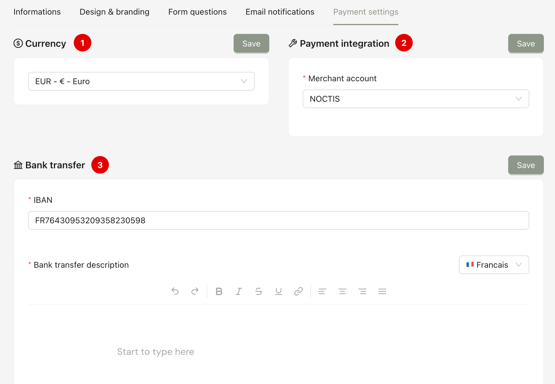 From the program detail page, click the tab Payment Settings. This page is to configure the main functions of the payment step when the customer fills in the form. You can configure these: