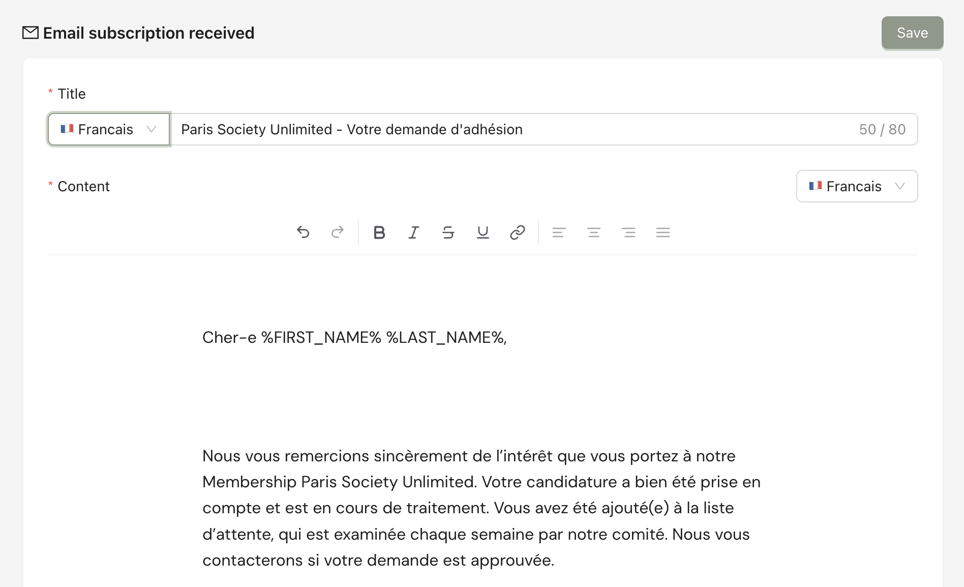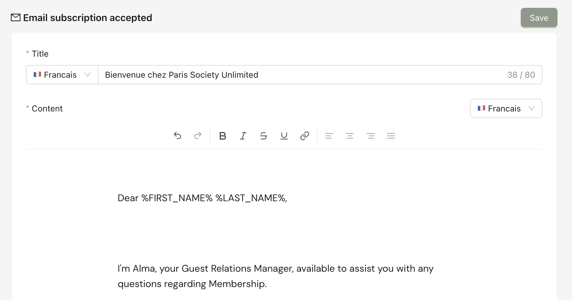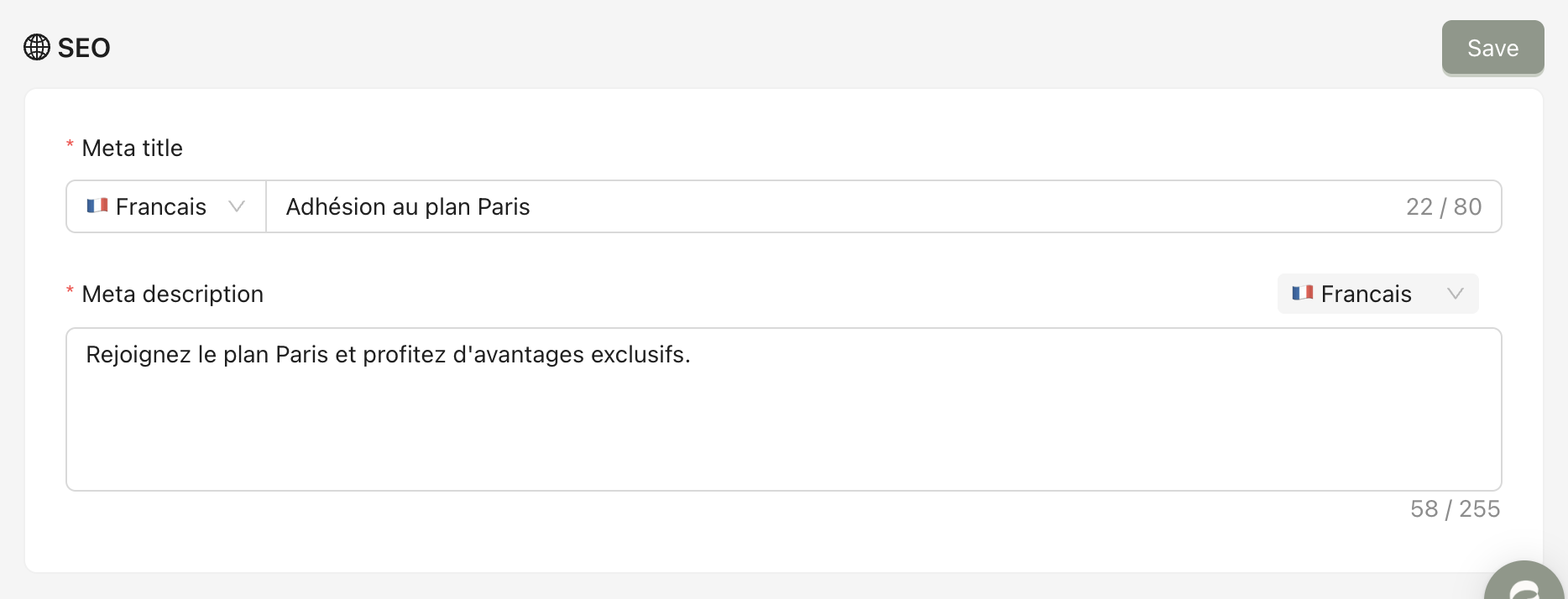 After making changes to each section, don’t forget to click Save. You have to fill in titles and content in both French and English.