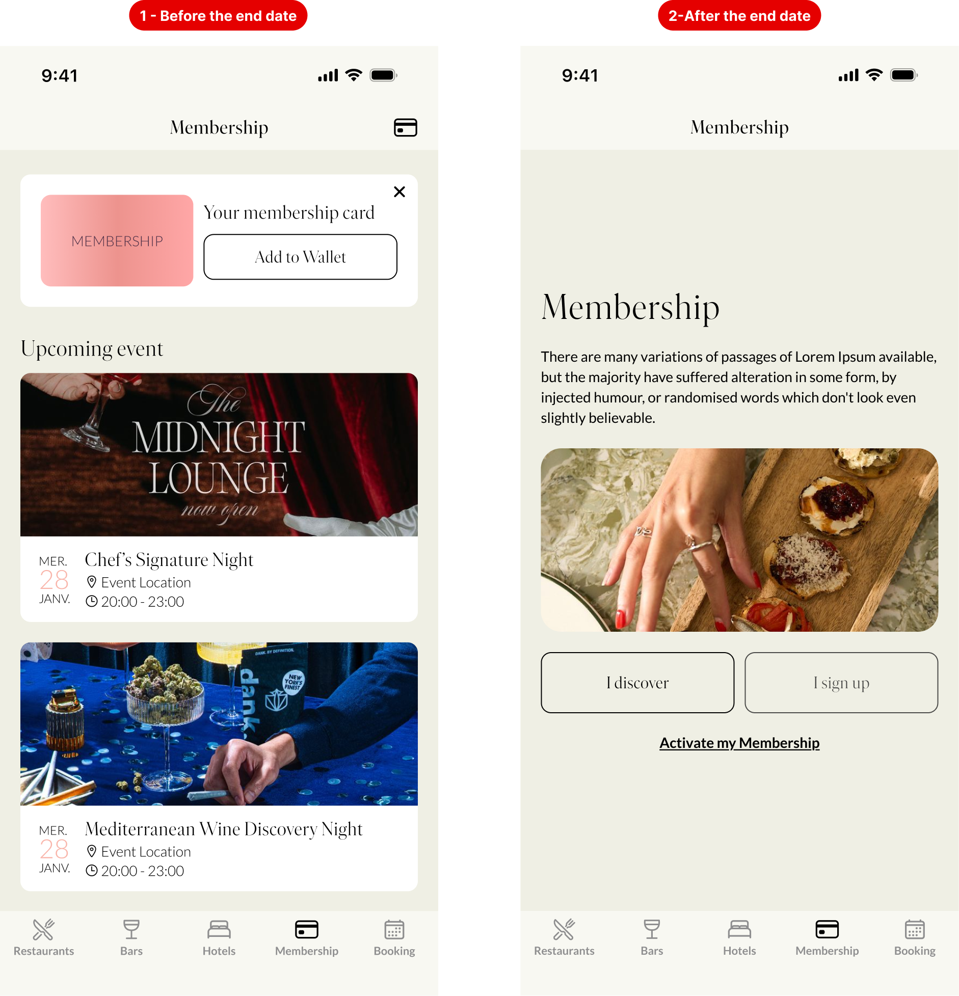 In the application, the member will continue to have access to the membership page until the end date (1). After that date, the page will return to its initial state (2).