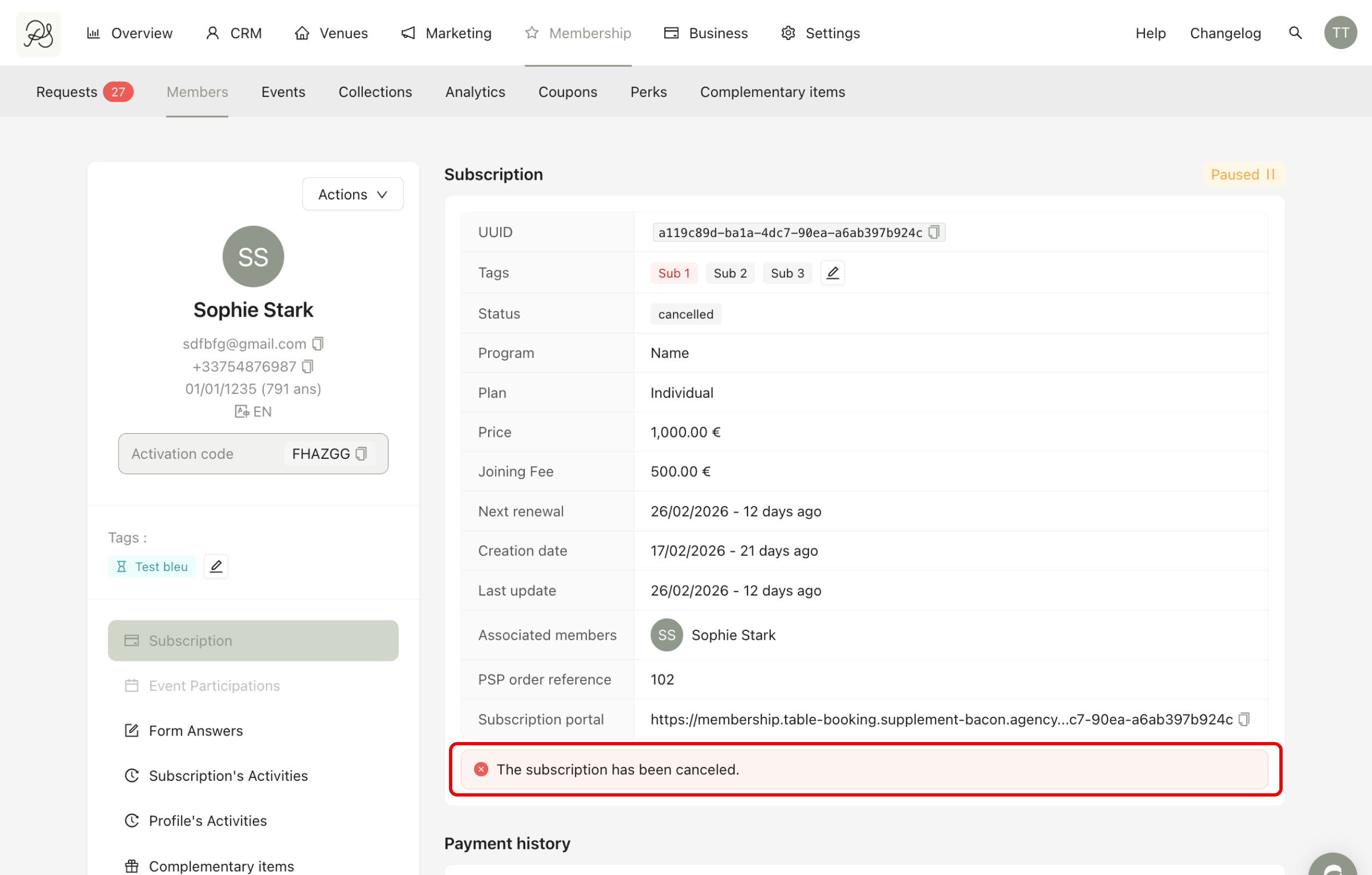 After cancellation, the member’s membership page in the application will return to its initial state, as if no active subscription is associated with the account.