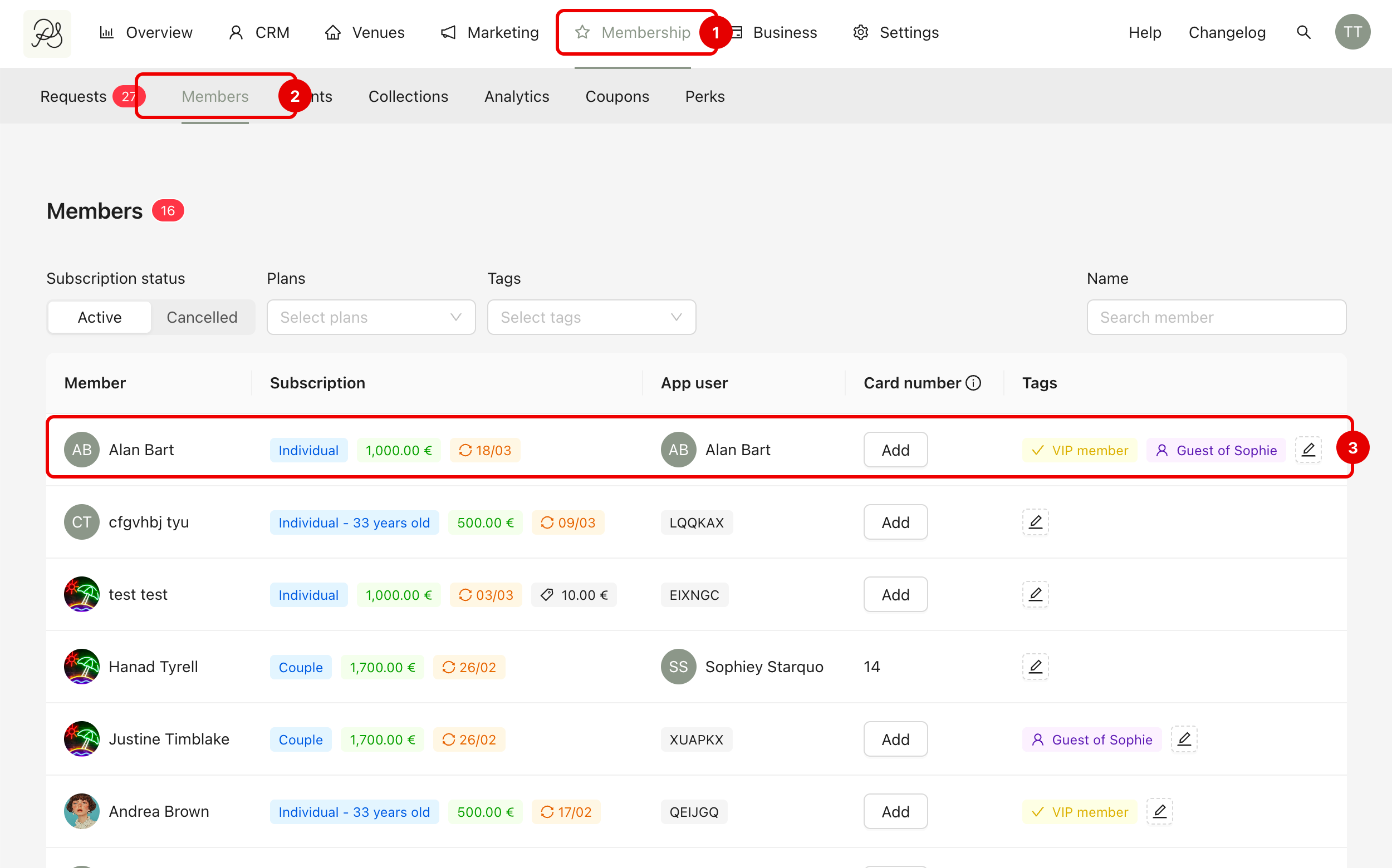 Step 1: Go to Membership (1) → Members (2), then select the member you want to manage (3).