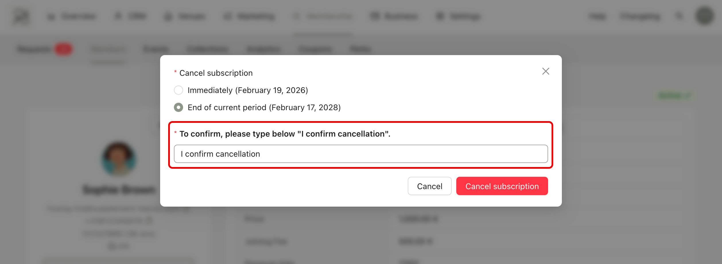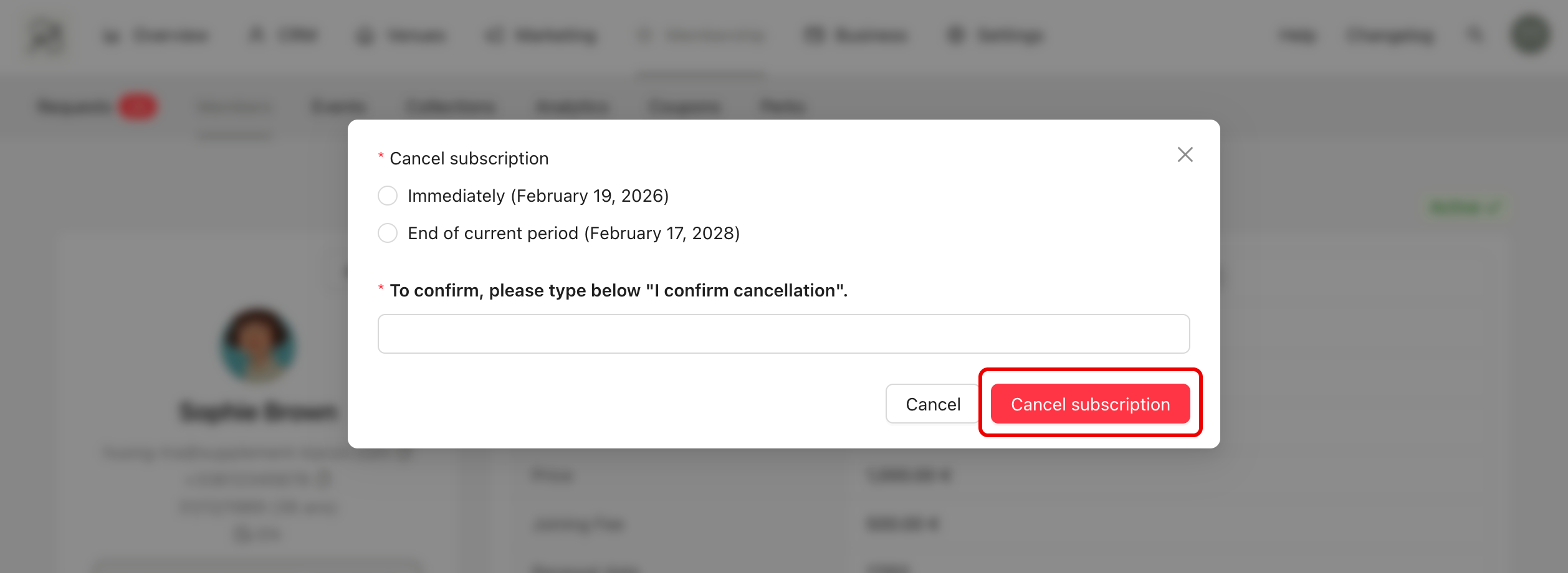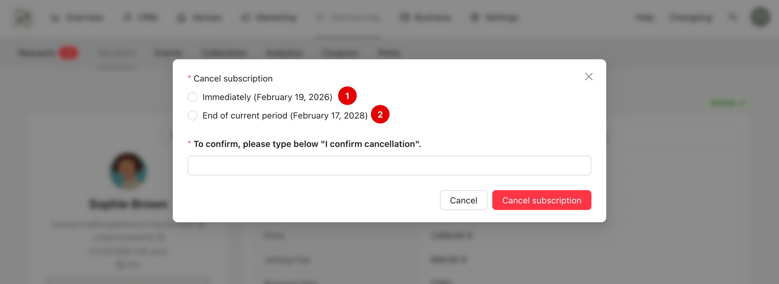 End of current period (2): The subscription remains active until the renewal date. For example, if the renewal date is February 17, the member keeps access until that date. After that, the subscription is automatically cancelled and access is removed.