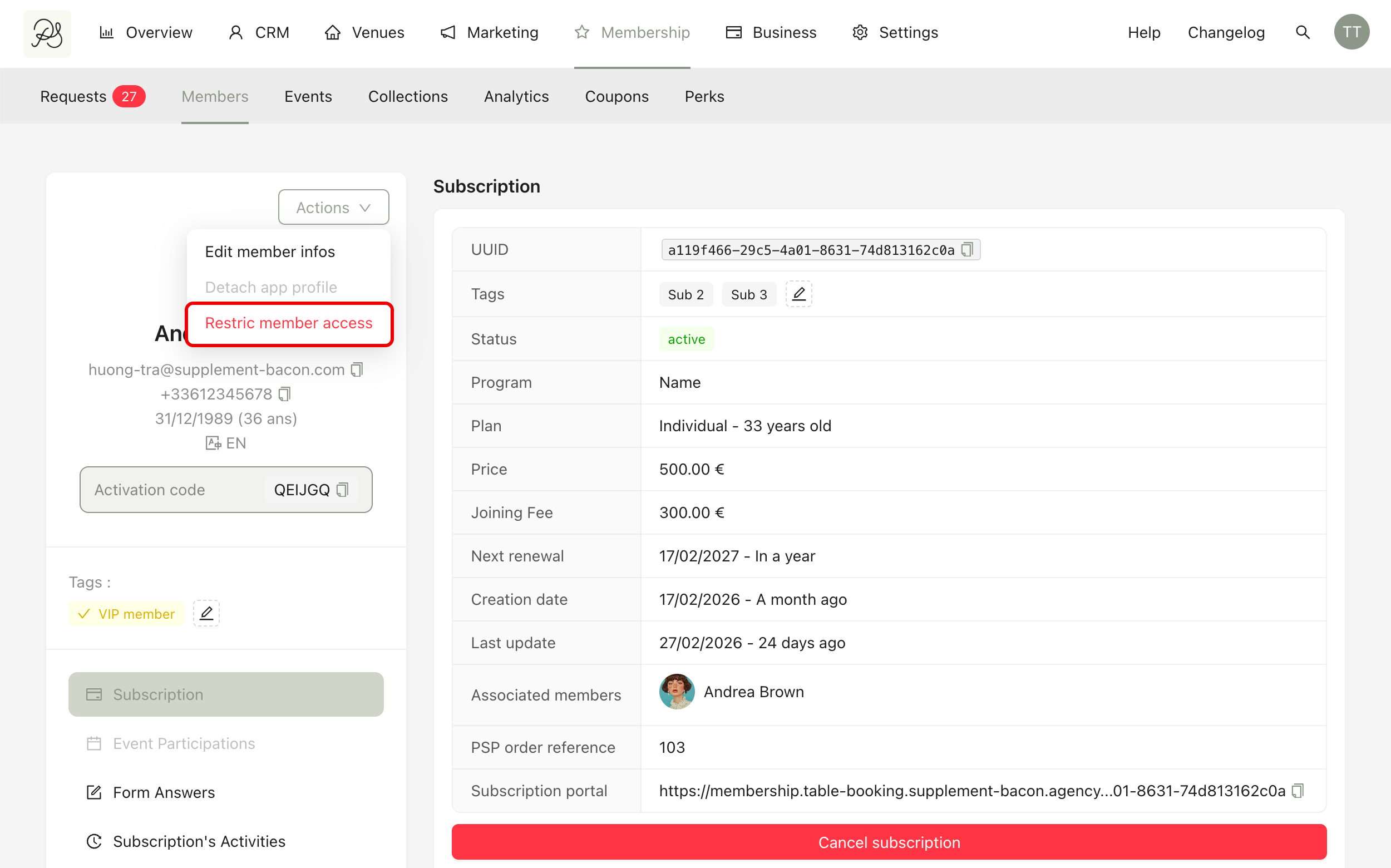 You can cancel a membership subscription either immediately or at the end of the current billing period.