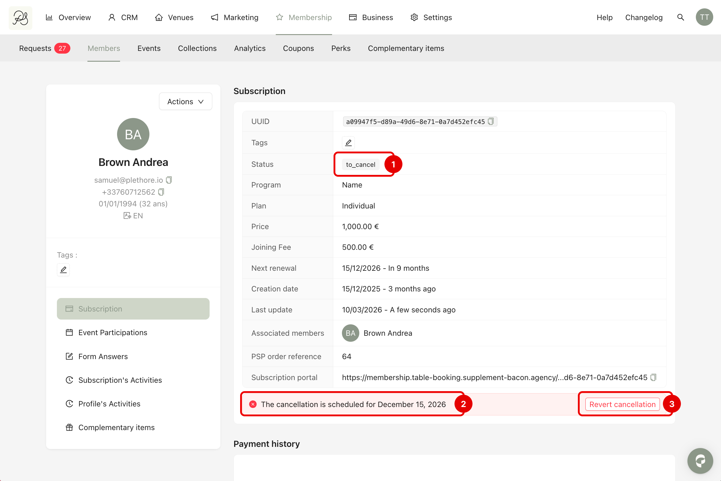 You can still revert this action anytime before the renewal date by clicking Revert cancellation (3). If not reverted, the subscription will automatically switch to Cancelled on the scheduled date.