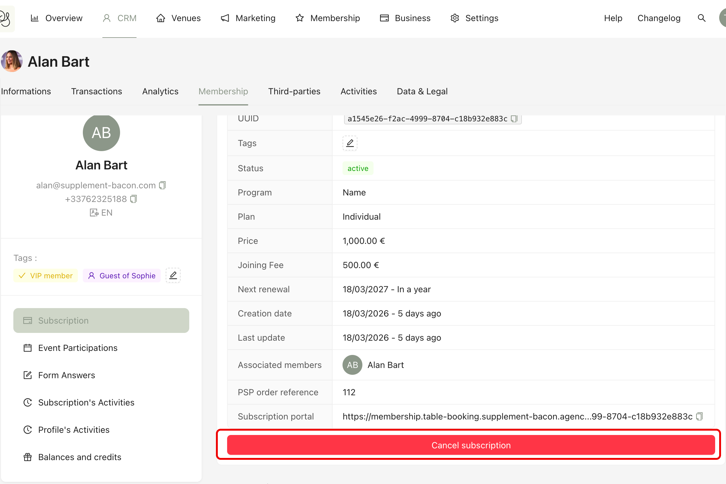 By default, subscriptions automatically renew on their anniversary date. However, from the dashboard, you can manually manage cancellations and control exactly when access to the membership ends.
