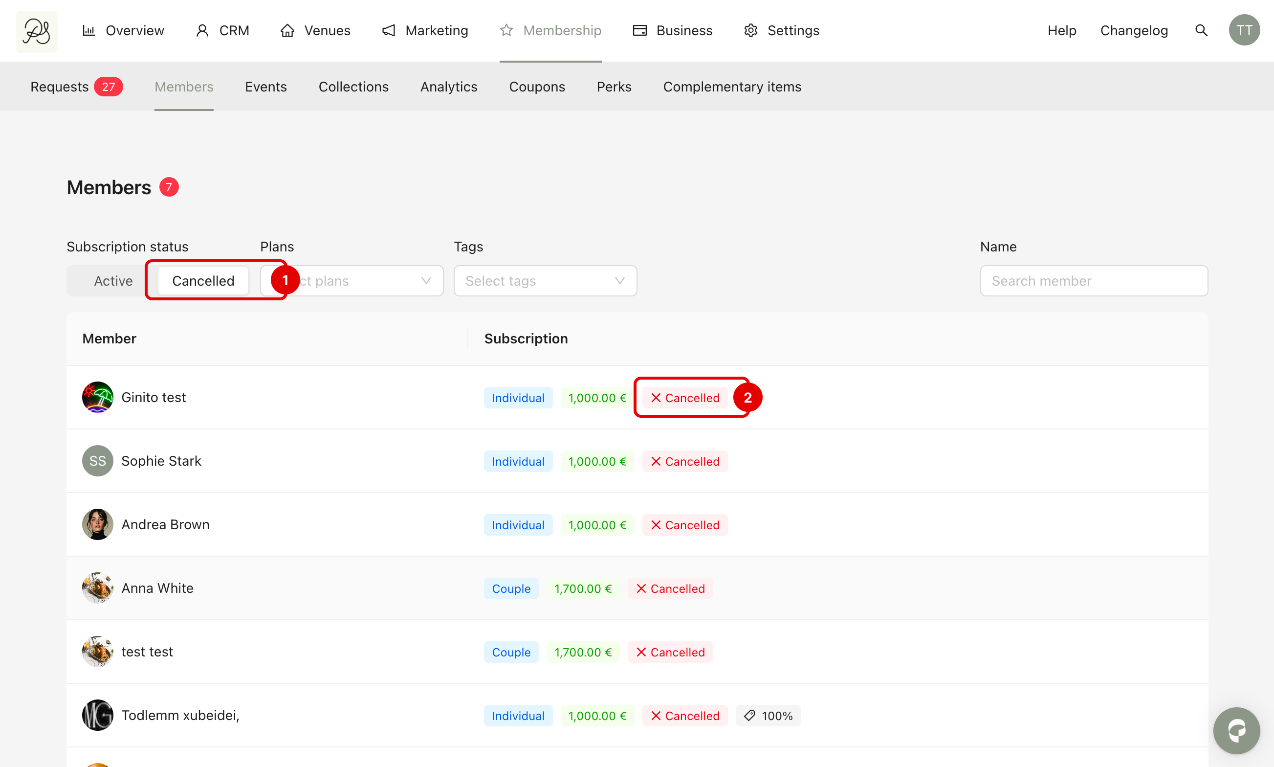After an immediate cancellation, the member will appear in the Cancelled tab (1). In the Subscription column, a Cancelled badge (2) will replace the renewal date badge.