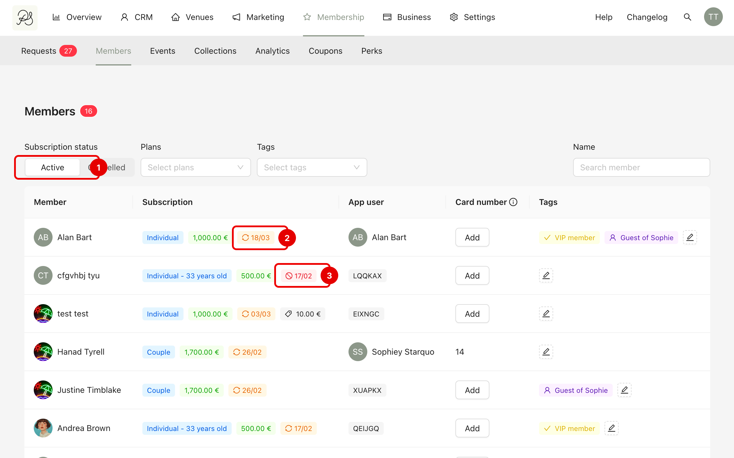 After a delayed cancellation, the member will still appear in the Active tab (1). However, the renewal date badge will turn red (2) instead of orange (3), indicating that the subscription will not be renewed.
