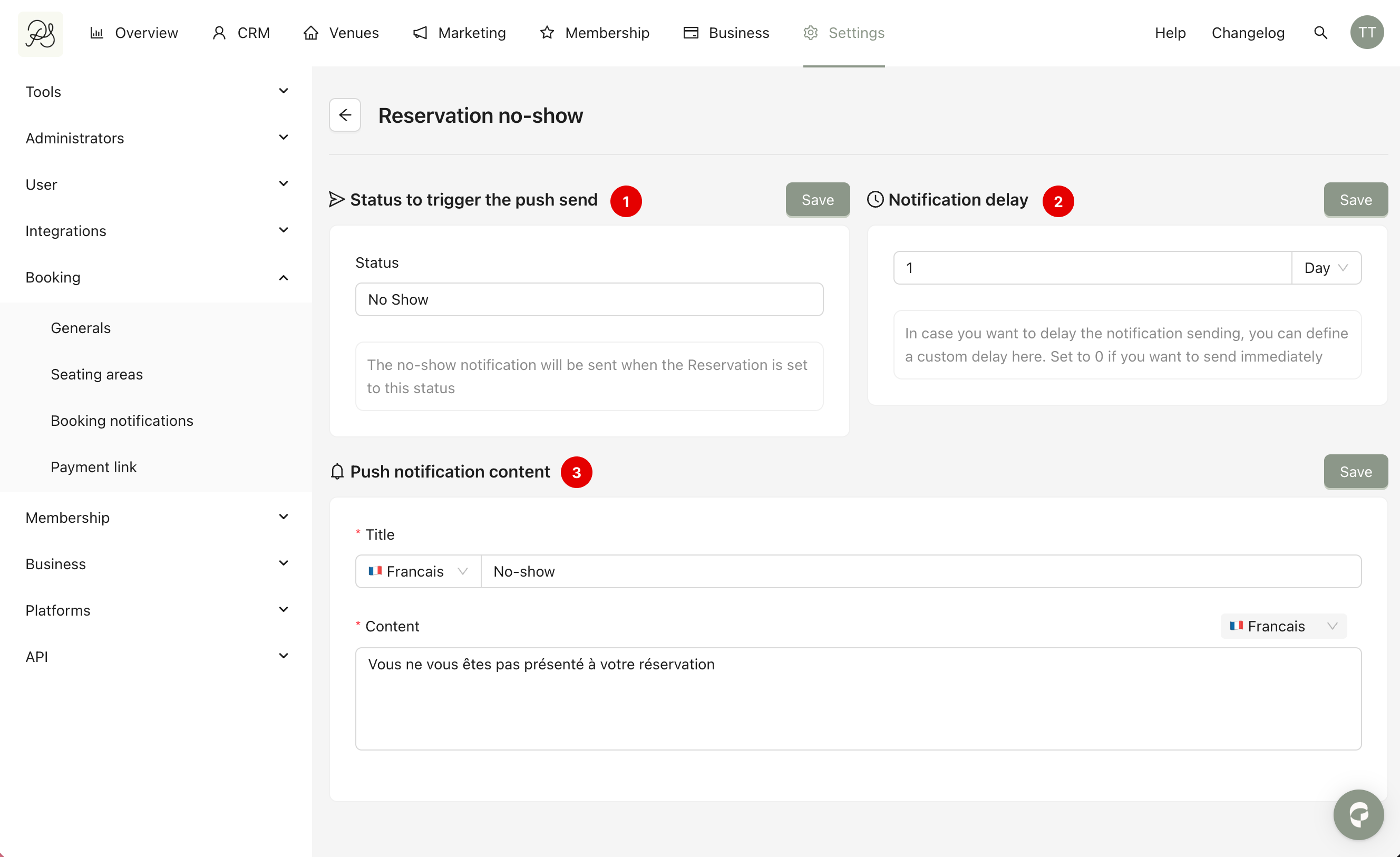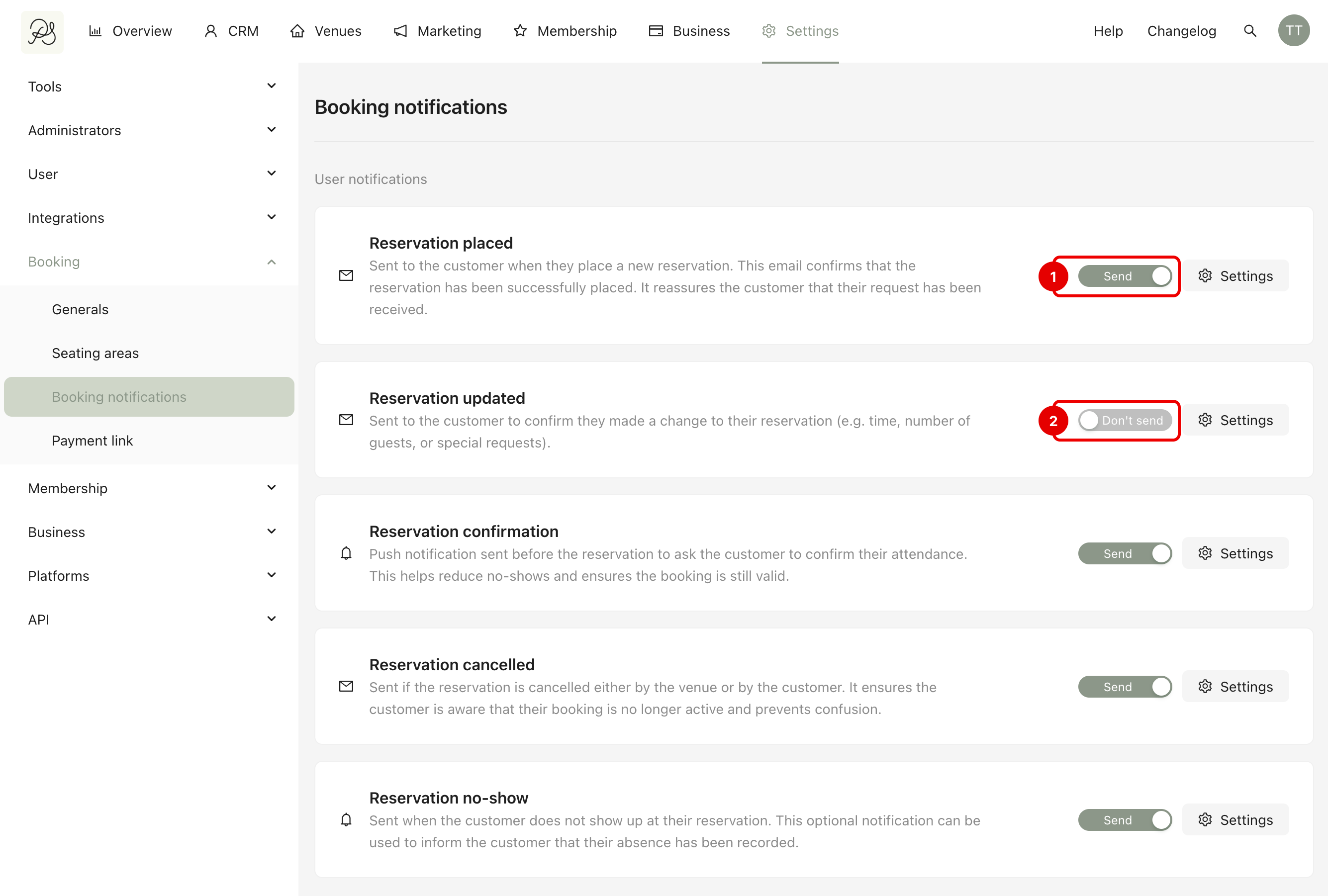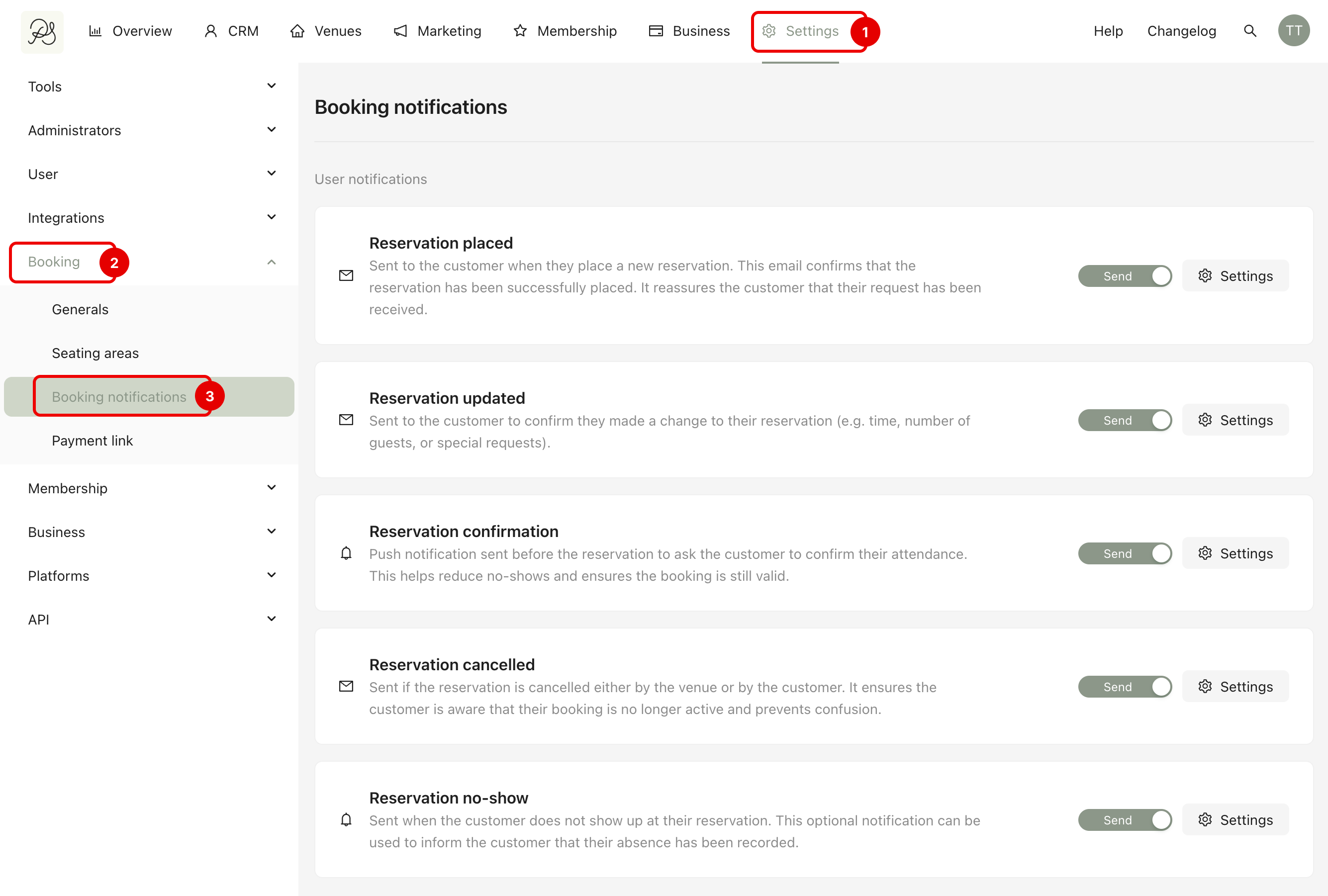 Go to Settings (1) → Booking (2) → Booking notifications (3). You will see the list of all notification types with activation toggles and configuration options.