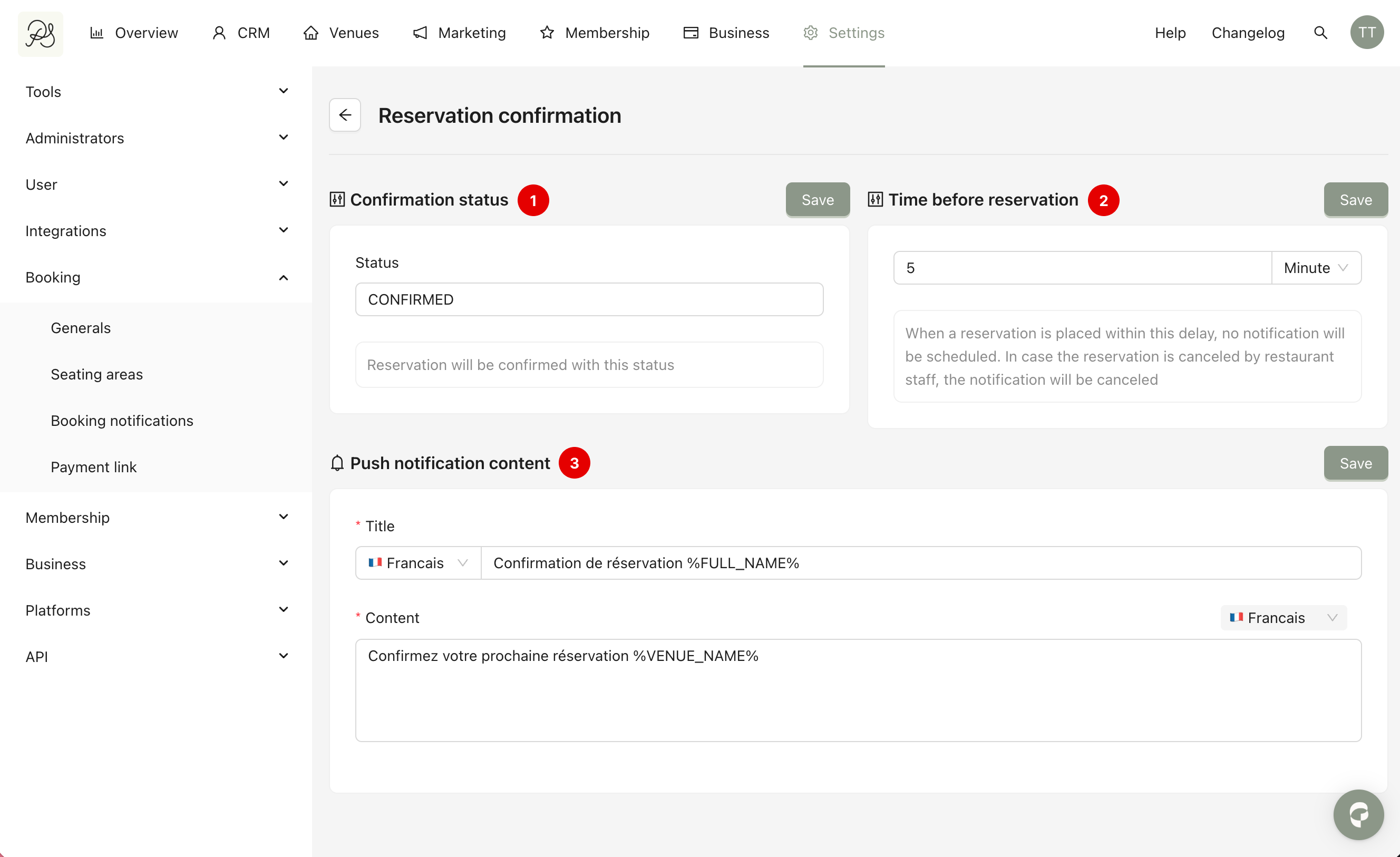 Time before reservation (2): This defines how long before the reservation date the push notification is sent. If a reservation is created within this delay period, no confirmation notification will be scheduled. If the reservation is cancelled by the venue before the scheduled time, the confirmation notification will also be cancelled.