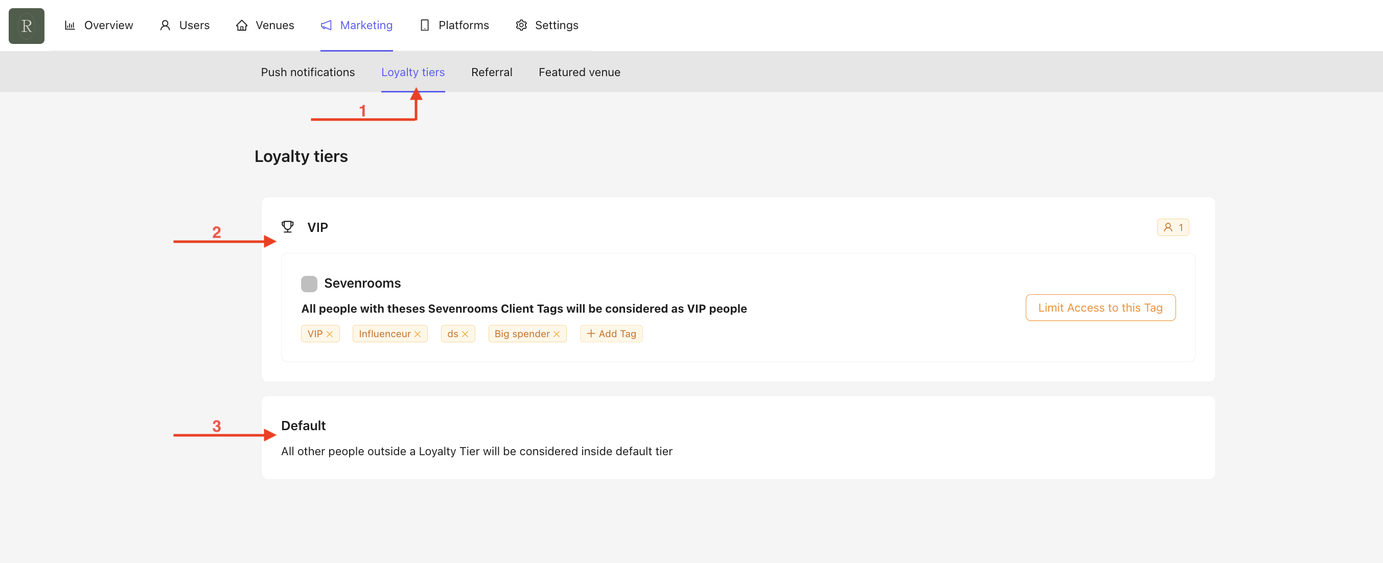 The VIP Loyalty Tier includes all users with SevenRooms tags defined below.