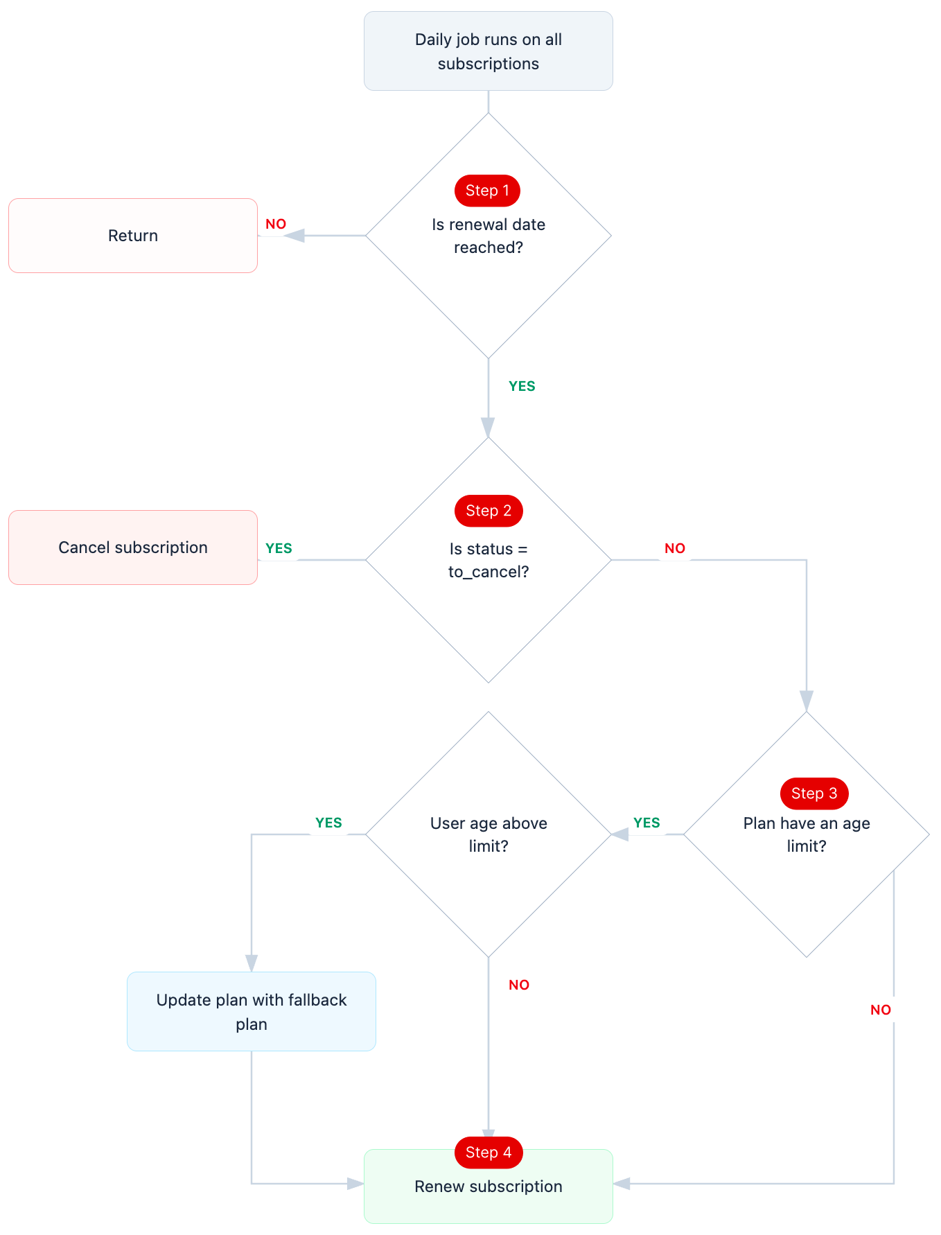Every day, the system runs a background job that reviews all subscriptions in the platform. This process ensures that subscriptions are renewed or cancelled at the correct time without manual intervention. The system follows the steps below: