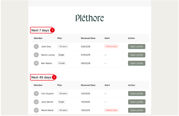 Every week, the system automatically sends an email to the membership team listing subscriptions that are approaching their renewal date. The email is divided into two sections to help teams plan their actions in advance: