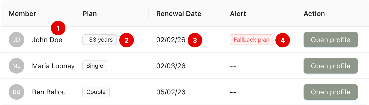 Alert (4): Subscriptions associated with age-limited plans will also be flagged if the member is expected to exceed the age limit at the time of renewal. This helps teams anticipate automatic transitions to fallback plans.