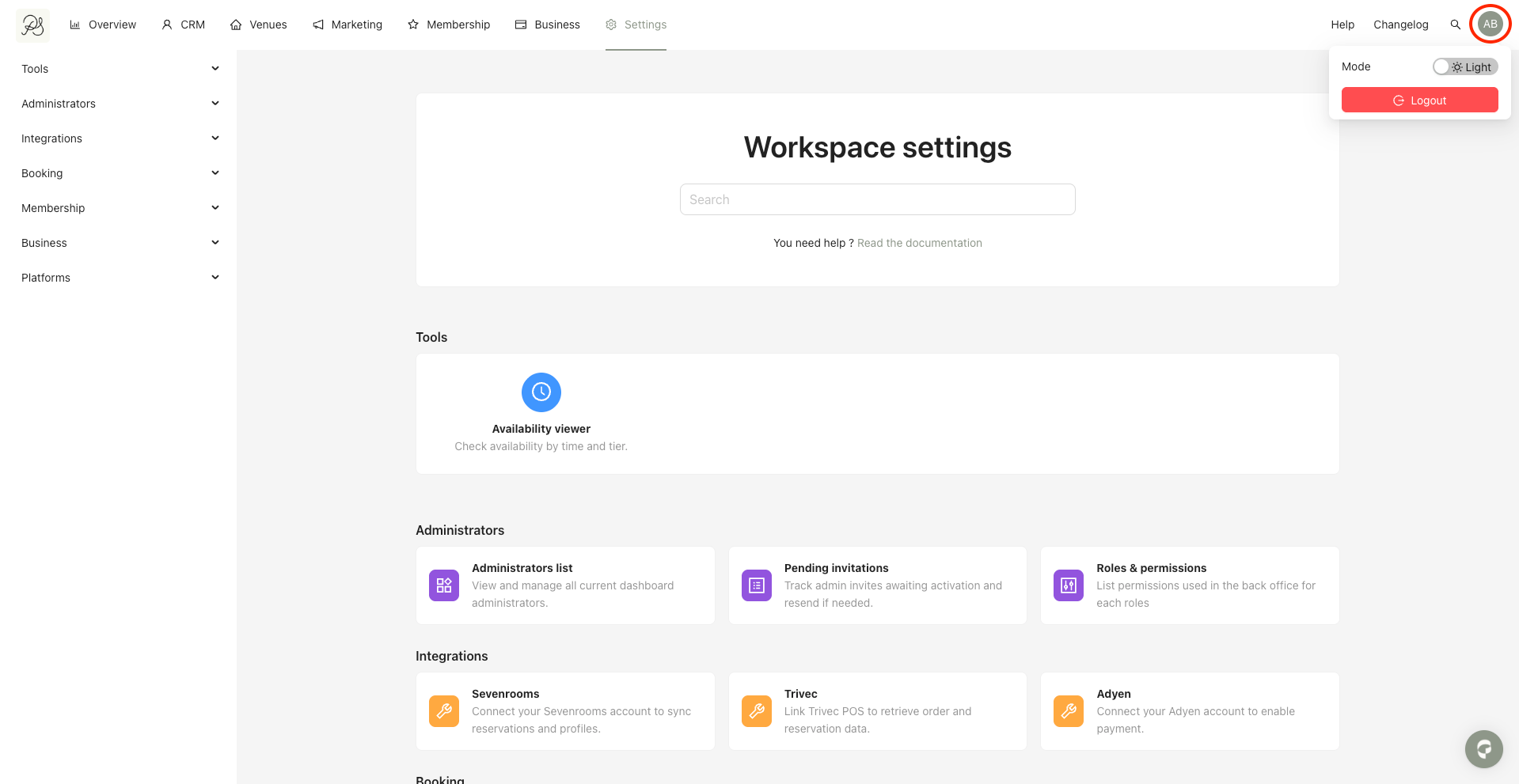 Hover over your initials located in the top-right corner of the screen (highlighted in red in the screenshot below), then click “Logout”.