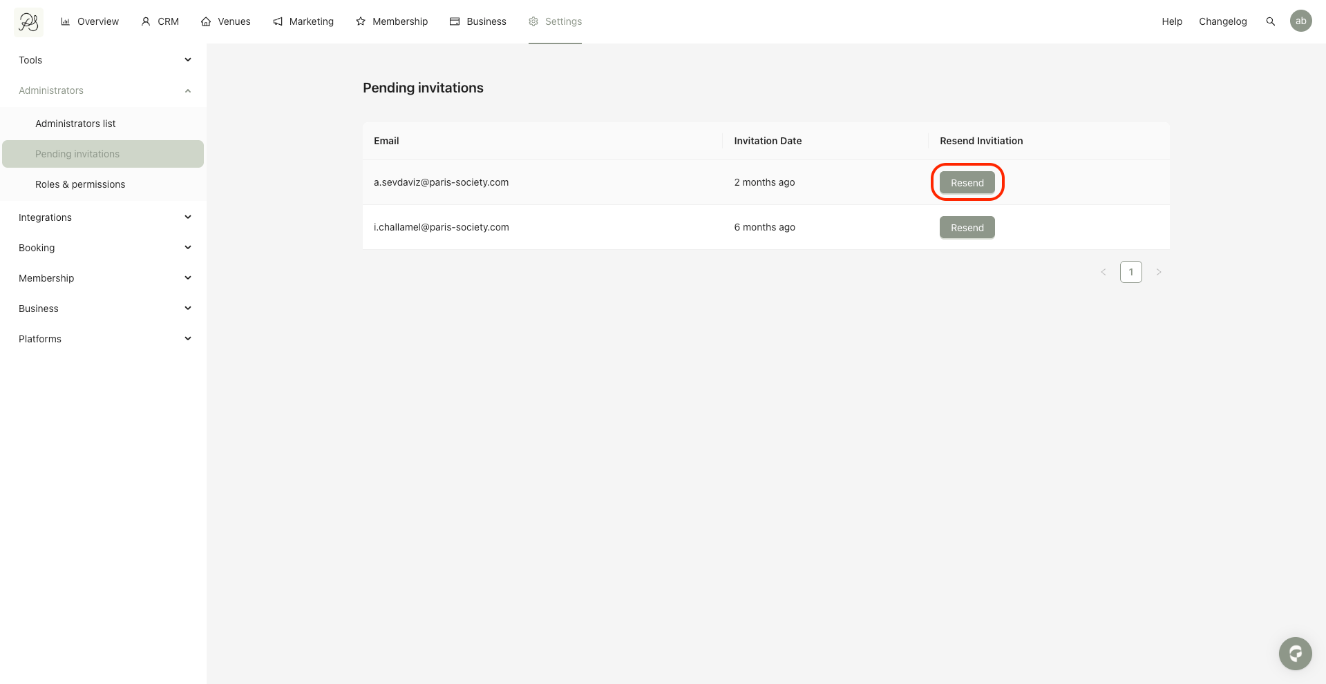 Step 1: To resend an administrator invitation, go to Settings → Administrators → Pending invitations.