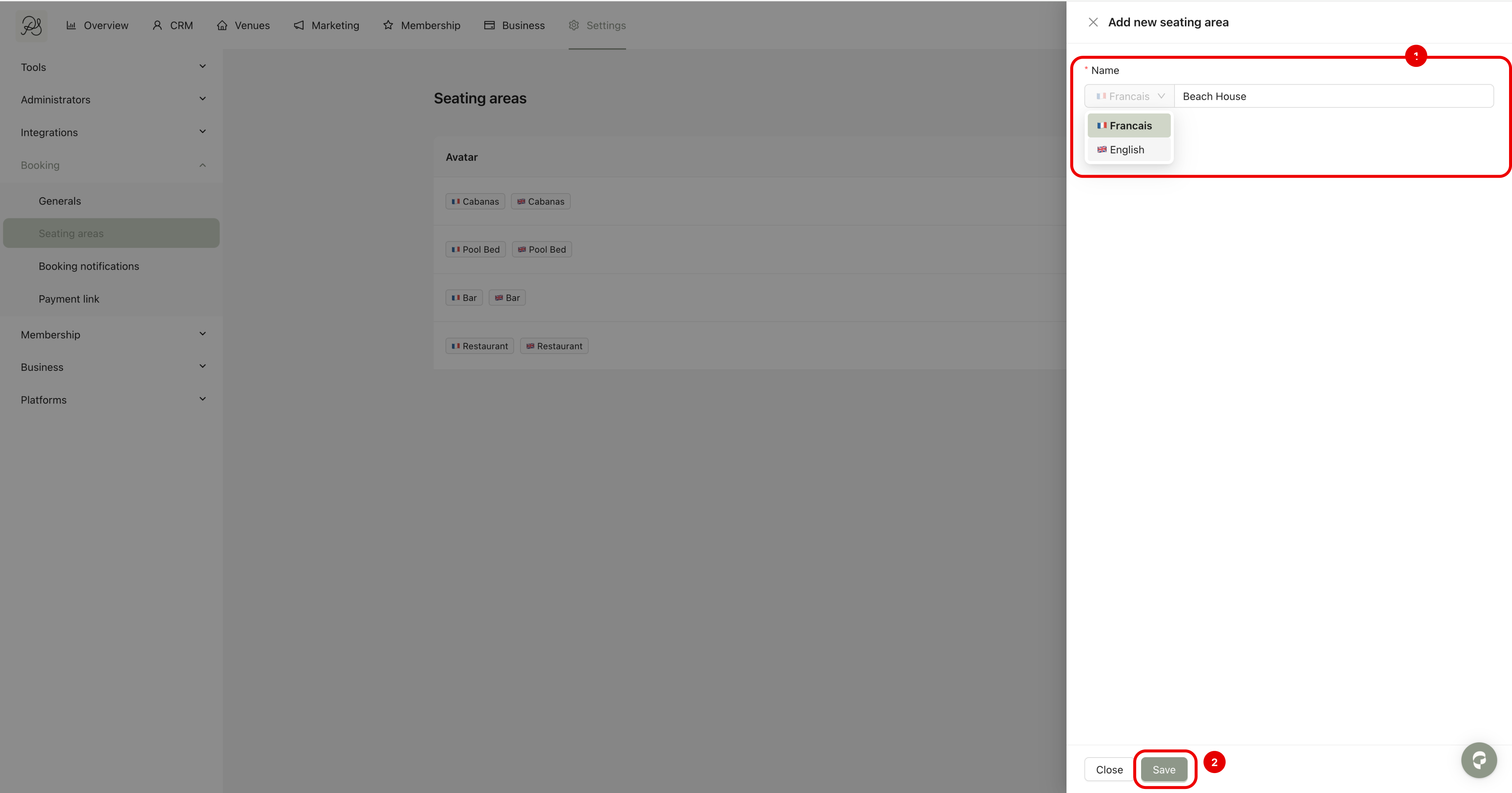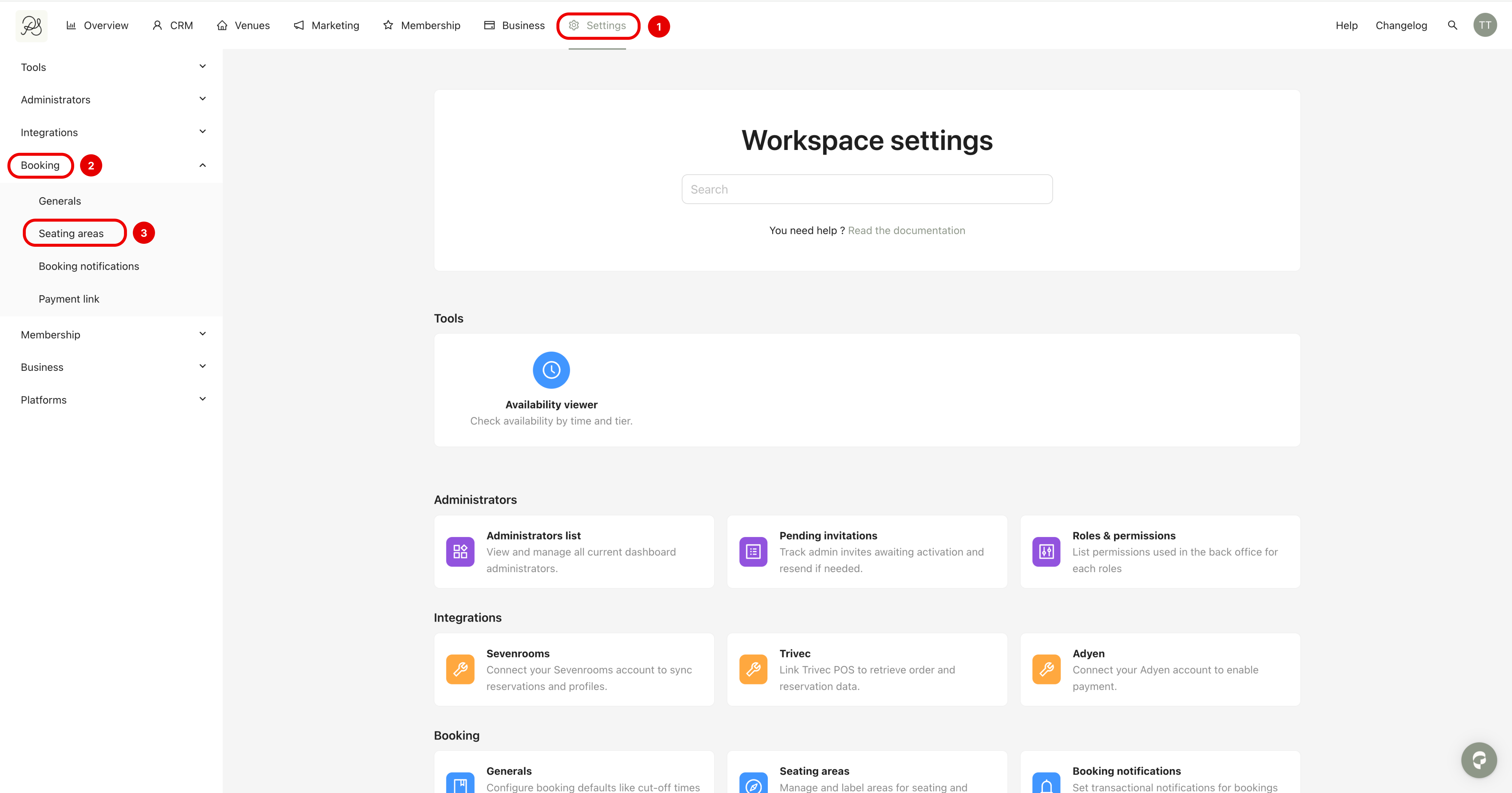 Step 1: To access the Settings Areas page, go to Settings (1) → Booking (2) → Settings Areas (3).