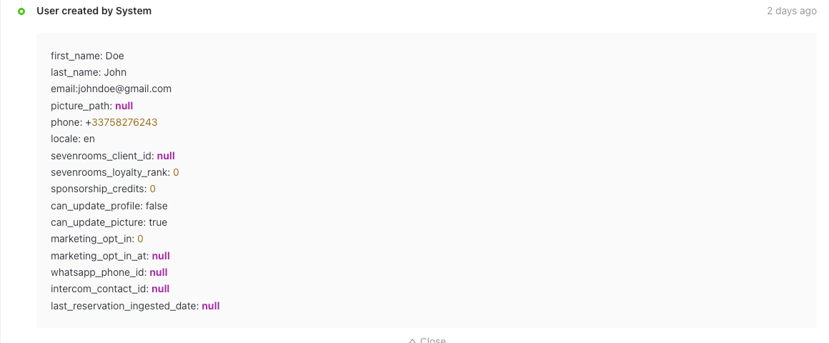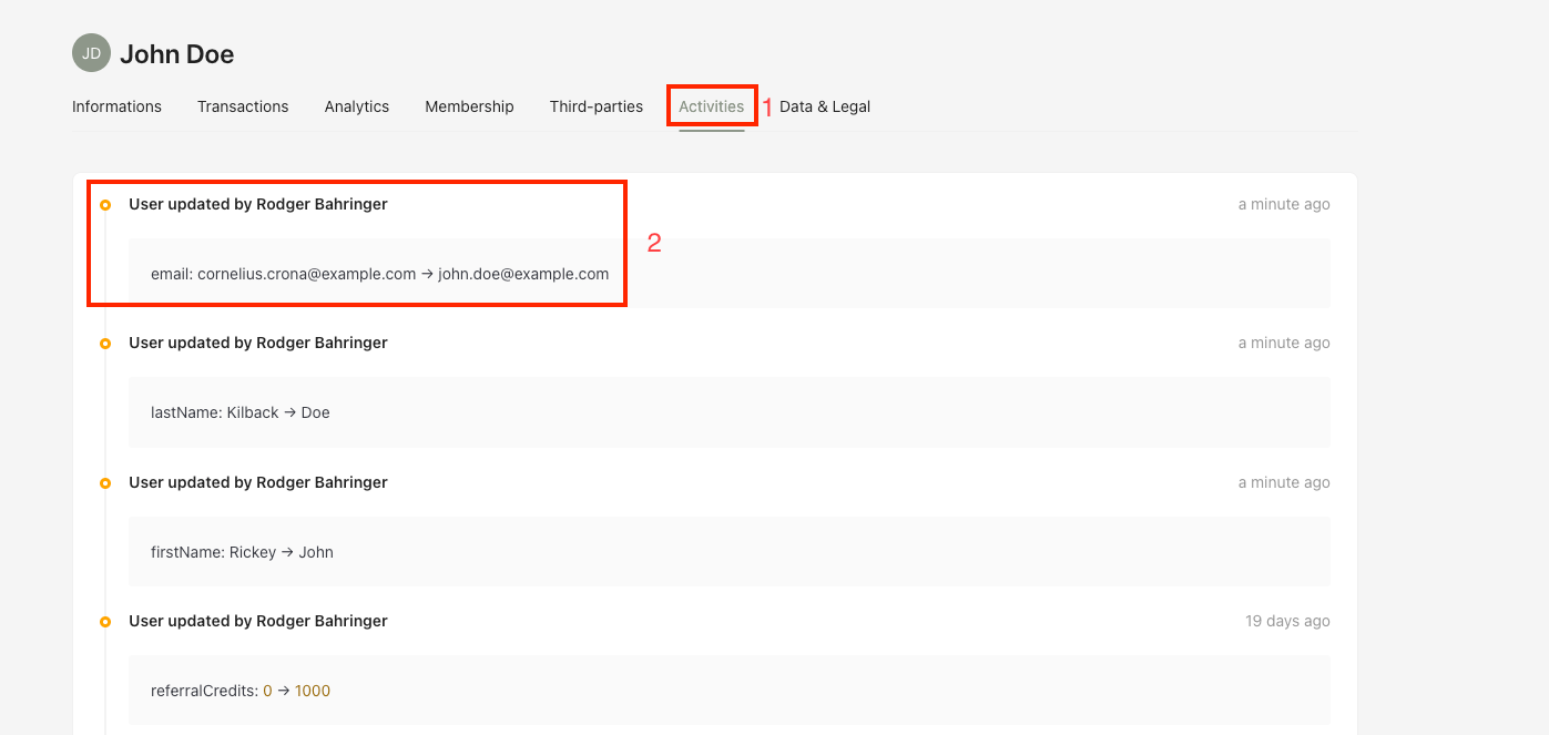Step 2: On the user detail page, click the Activities tab (1). You will see each milestone represents a change or interaction related to the user (2).