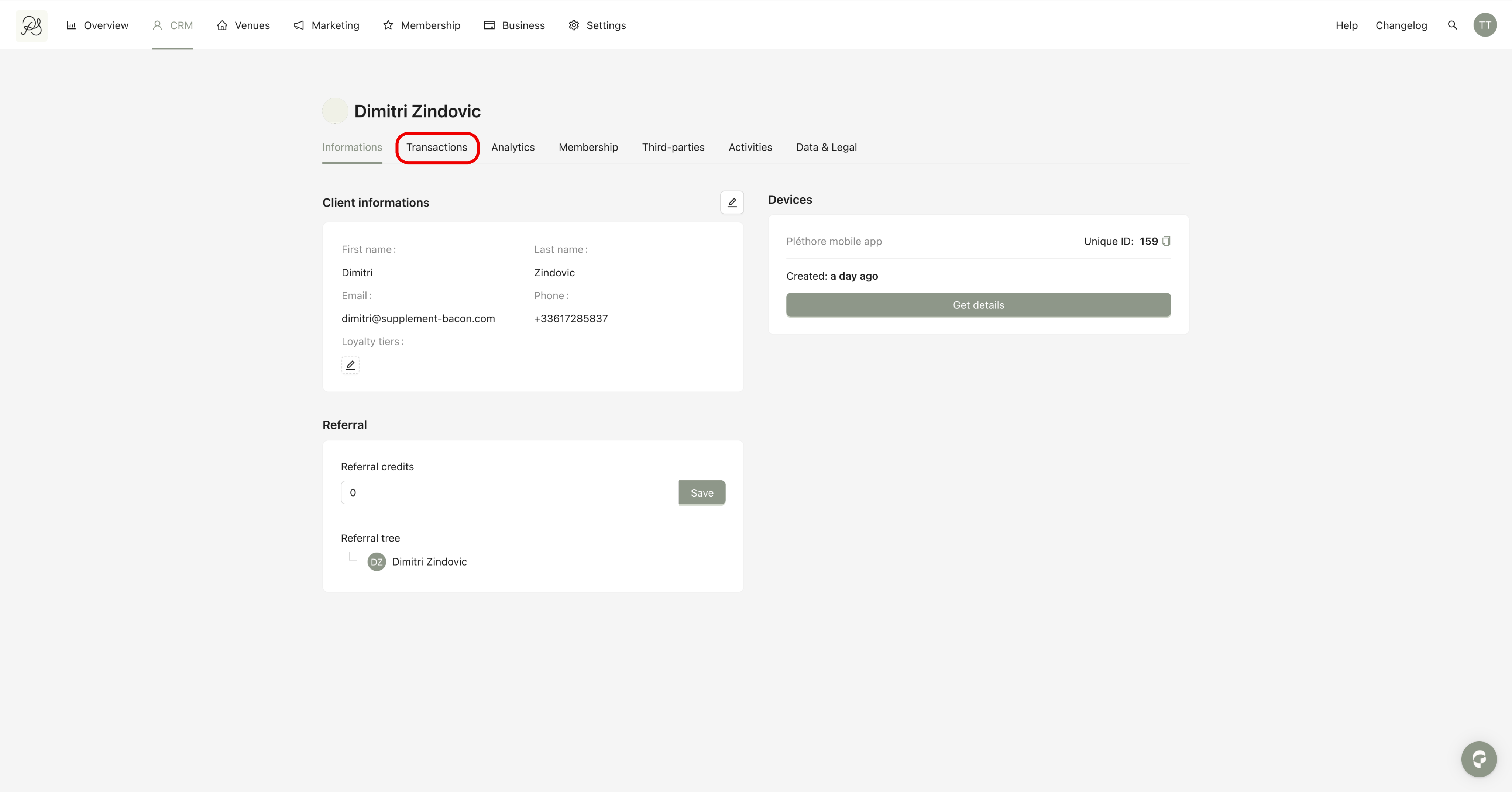 Step 2: On the user detail page, click the Transactions tab.