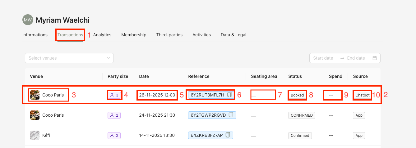 Each row (2) in the table represents one reservation made by the user. It includes the following information: