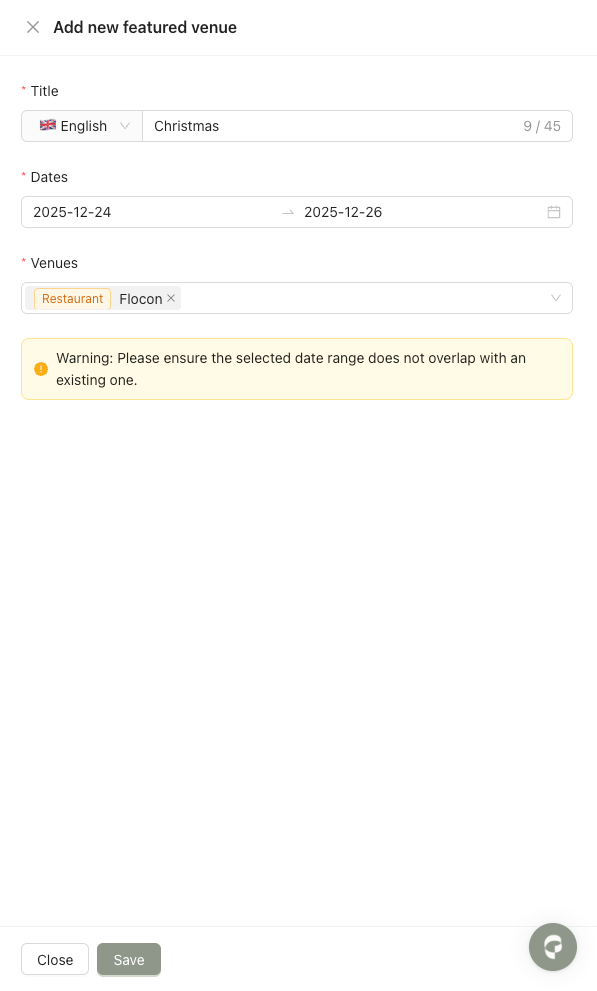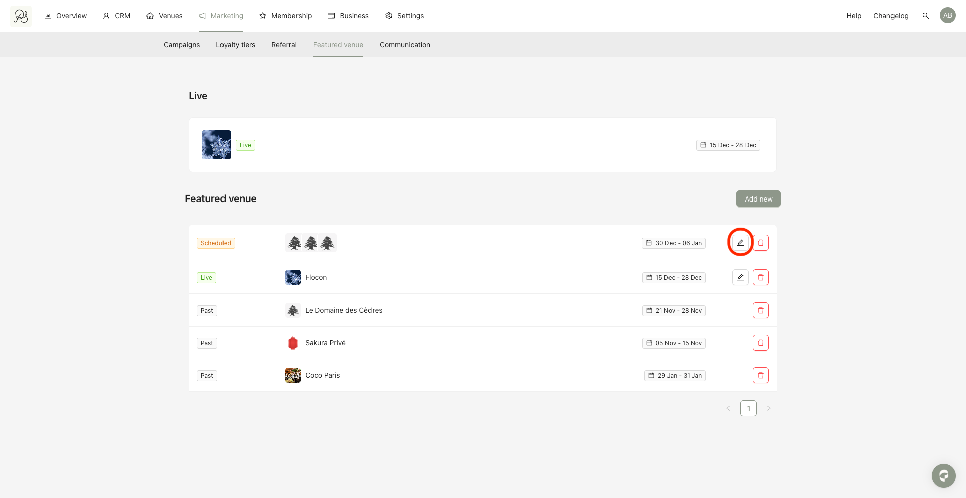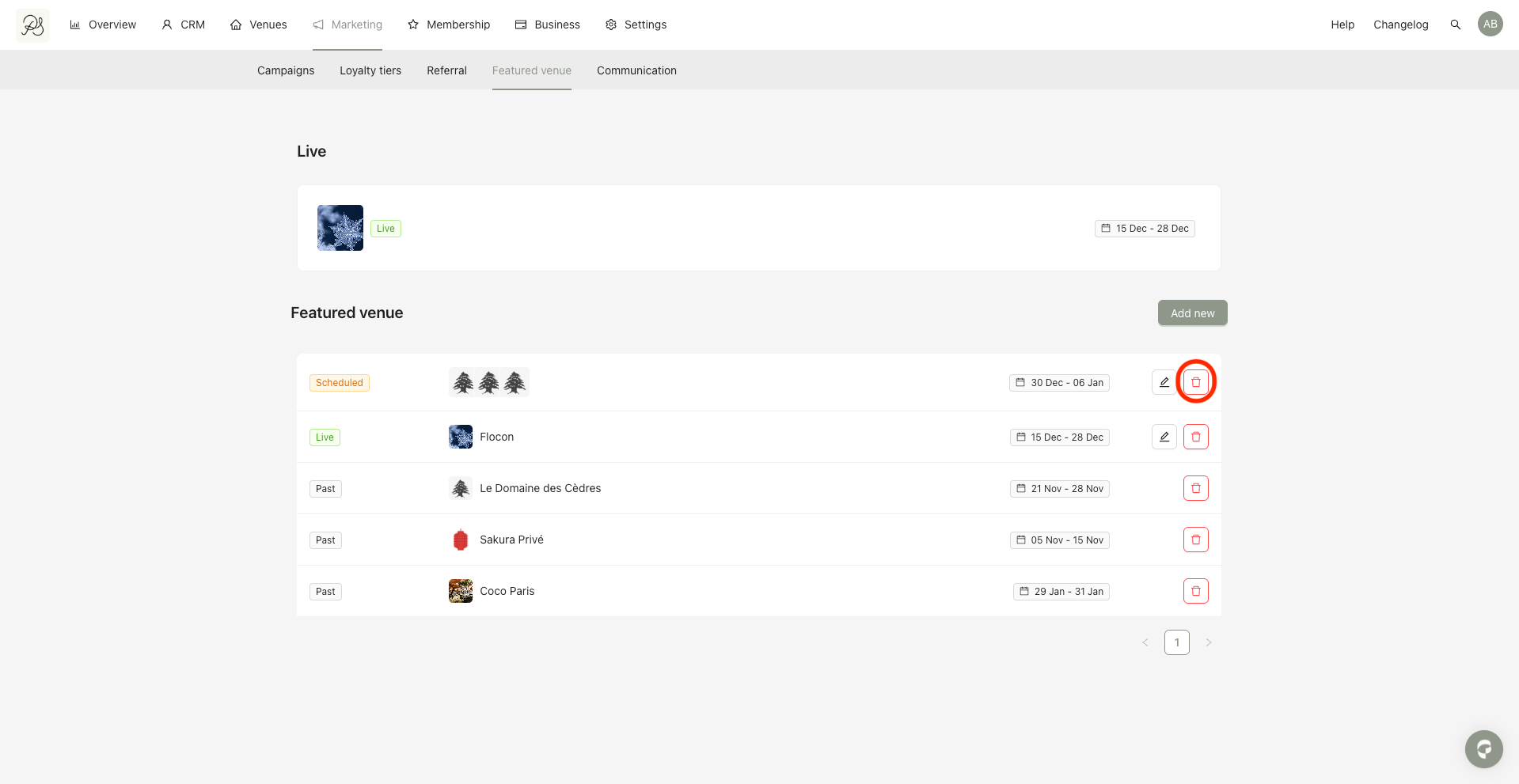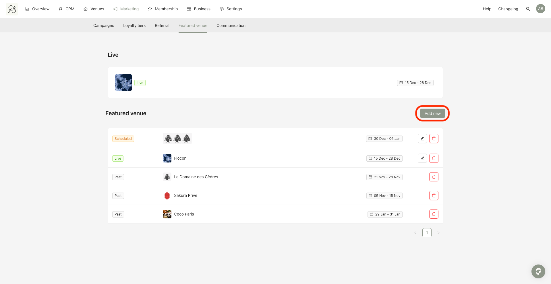 Step 1: Go to Marketing → Featured Venues. On this page, you can view current, scheduled, and past Featured Venues. Click Add new.