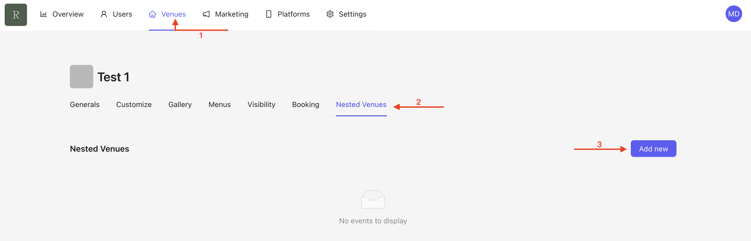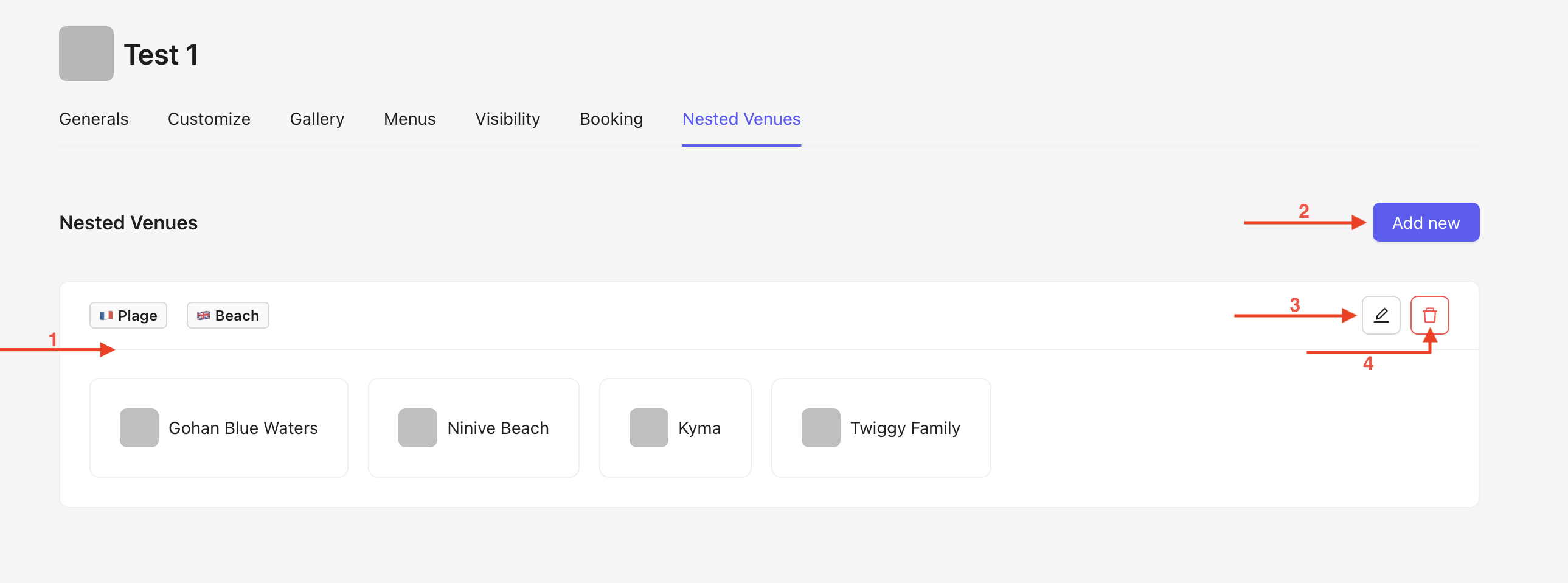 Visibility of the created nested venue with its title in the selected languages, displaying the chosen venues that have been attached.