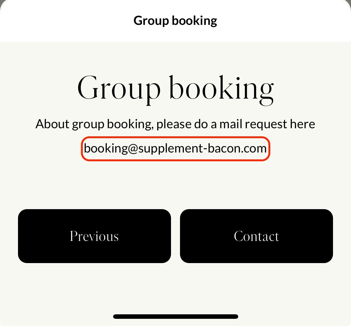 Below is how it appears in the mobile application. When a user attempts to make a reservation for more than 8 guests, a message will be displayed with the configured email address.