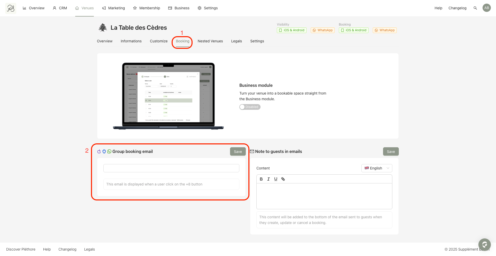 Step 2: Click the Booking tab (1), then scroll down to the Group booking email section highlighted in red (2). Enter an email address and click Save.