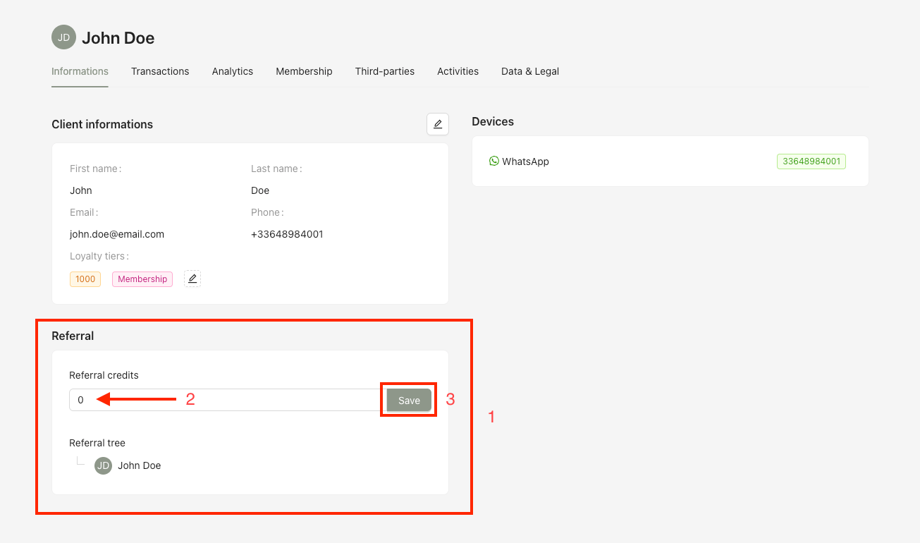 Step 2: On the user detail page, locate the Referral credits section (1). Enter the number of credits you want to assign to the user (2). Finally, click Save to apply the changes (3).