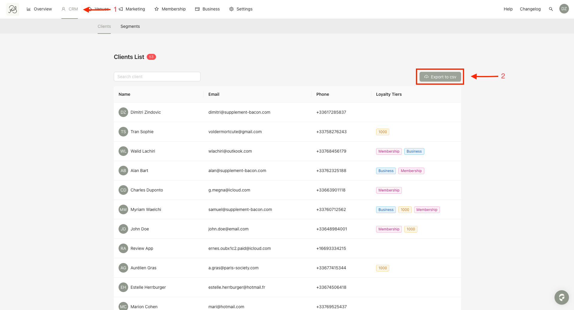 Step 1: From the homepage, click CRM (1), then Click Export to CSV (2).