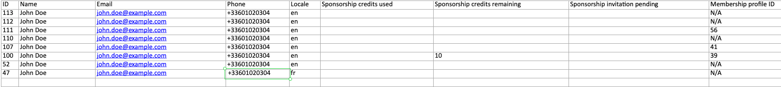 Step 3: Unzip the file and open the CSV. You will see a table containing user data similar to the example shown.
