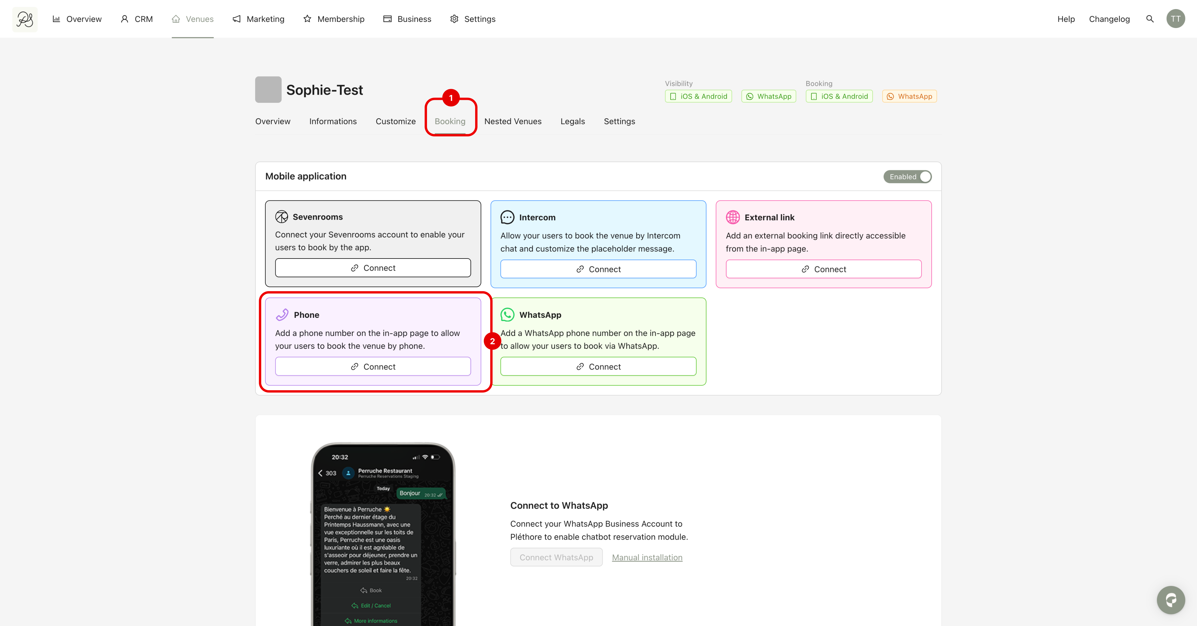 Step 2: Go to the tab Booking (1). In the Phone section, click Connect (2).