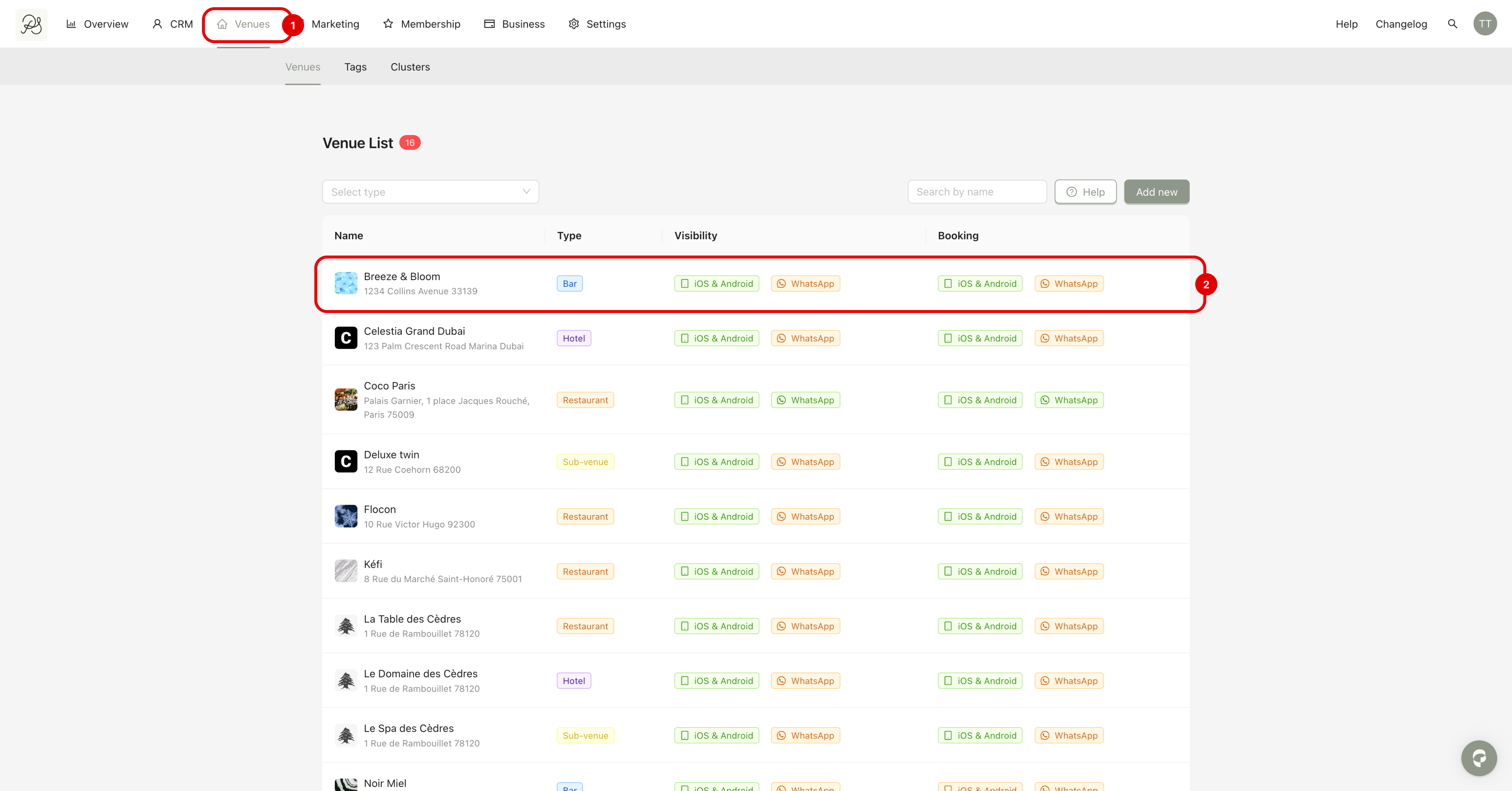 Step 1: Go to the Venues page (1) and select the venue you want to configure (2).
