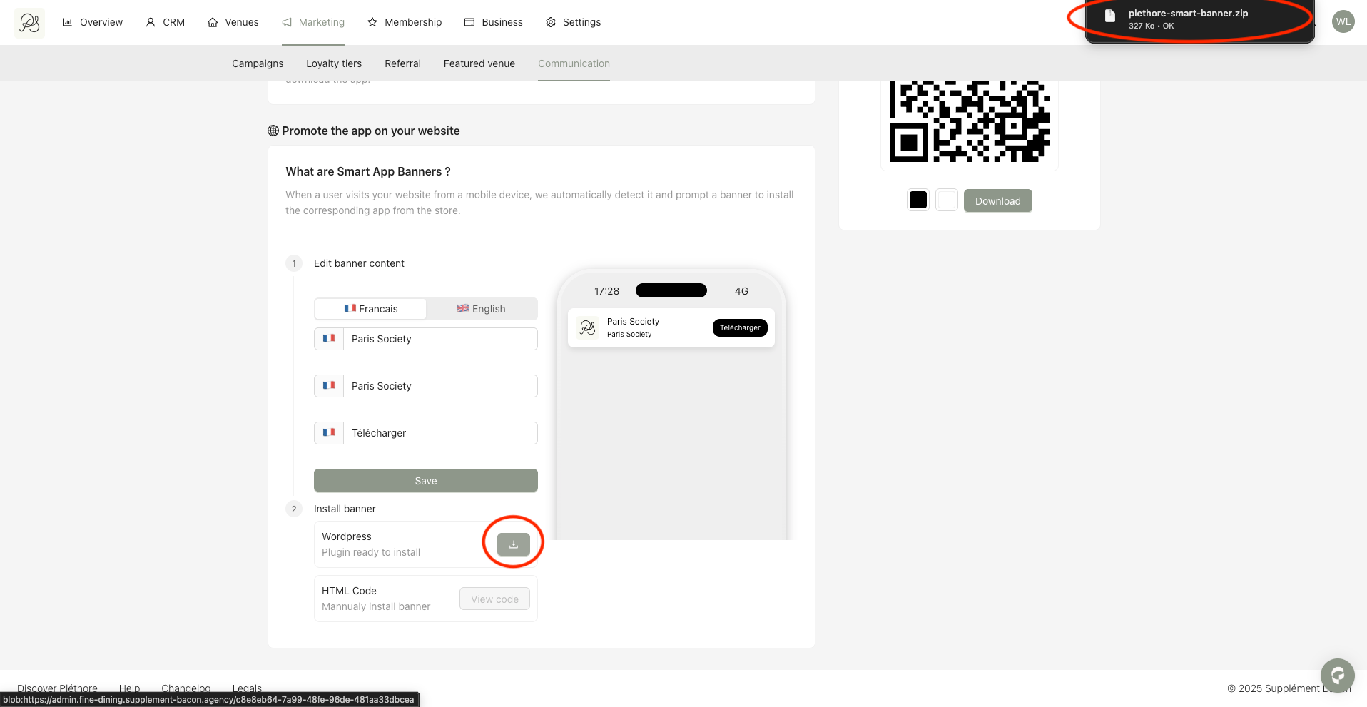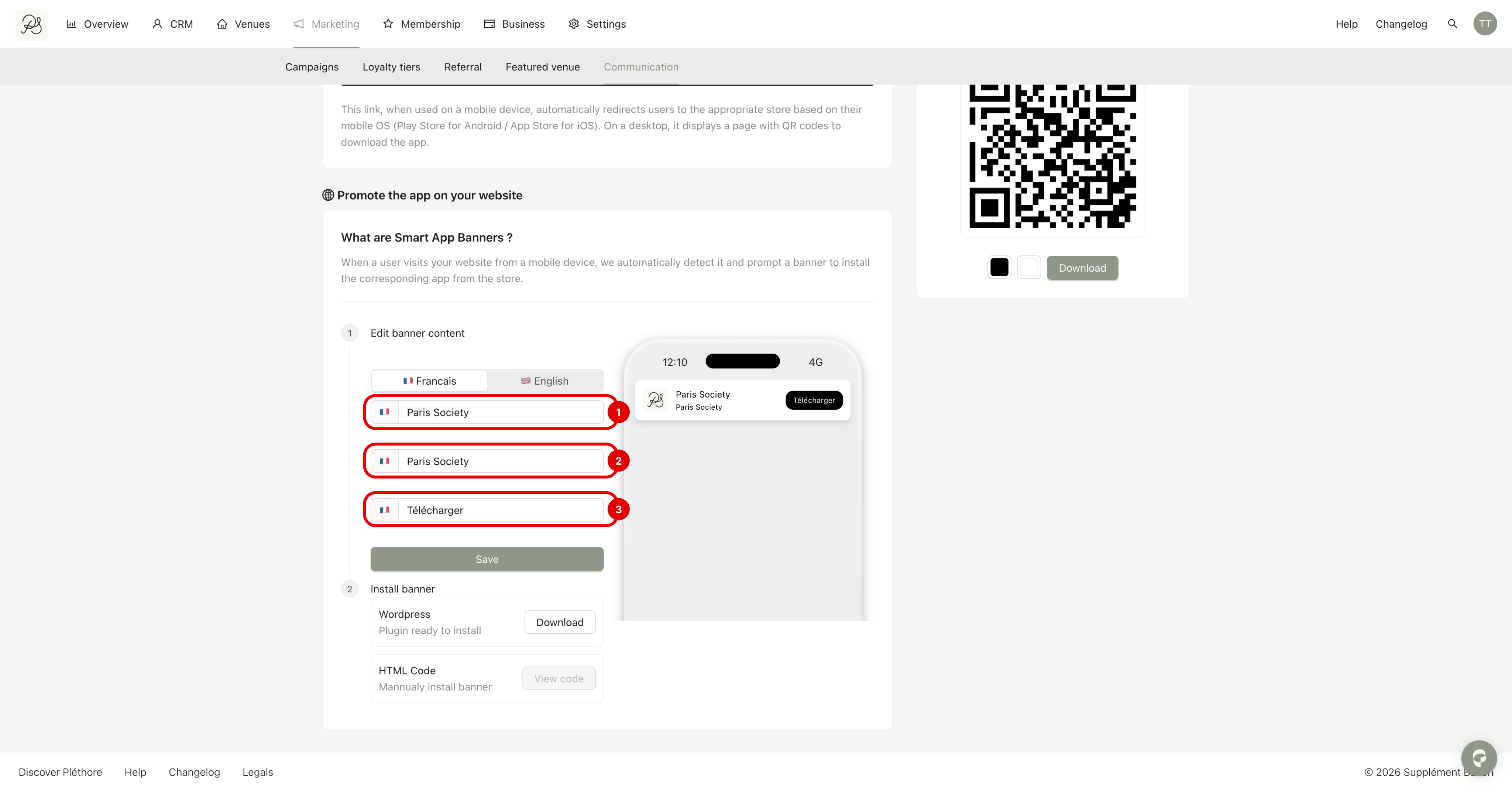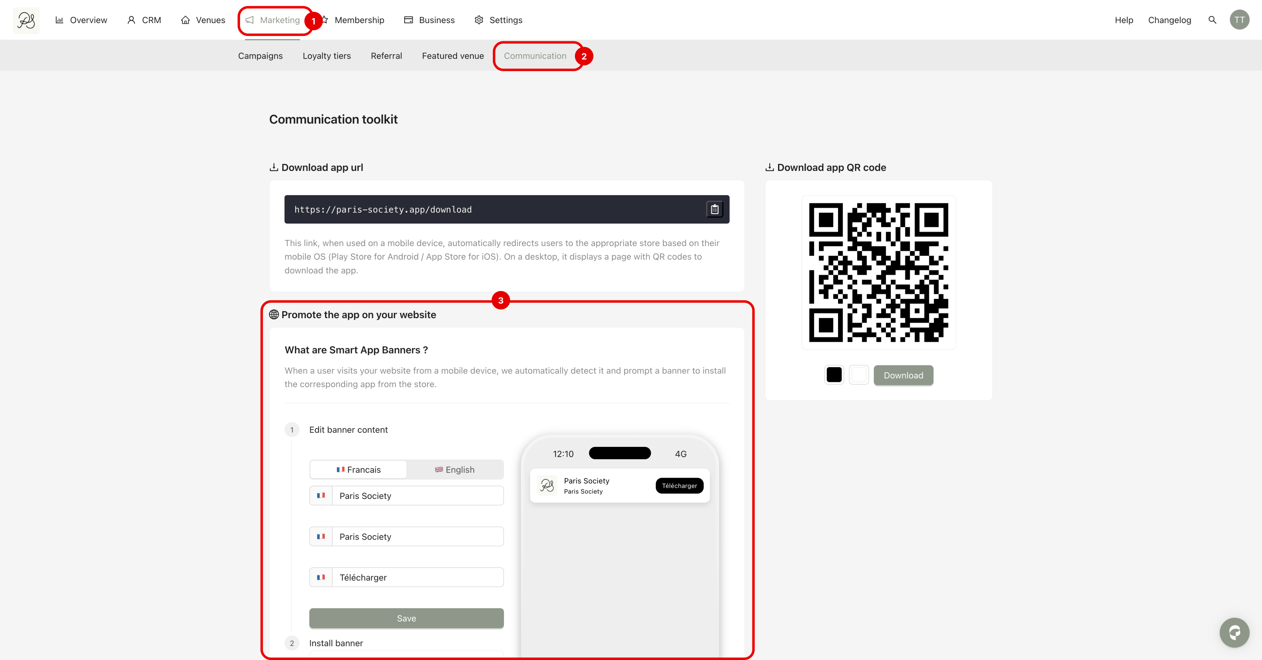 Step 1: Go to Marketing (1), then Communication (2). In this section, you will find Smart App Banners (3), where you can configure and install the banner.