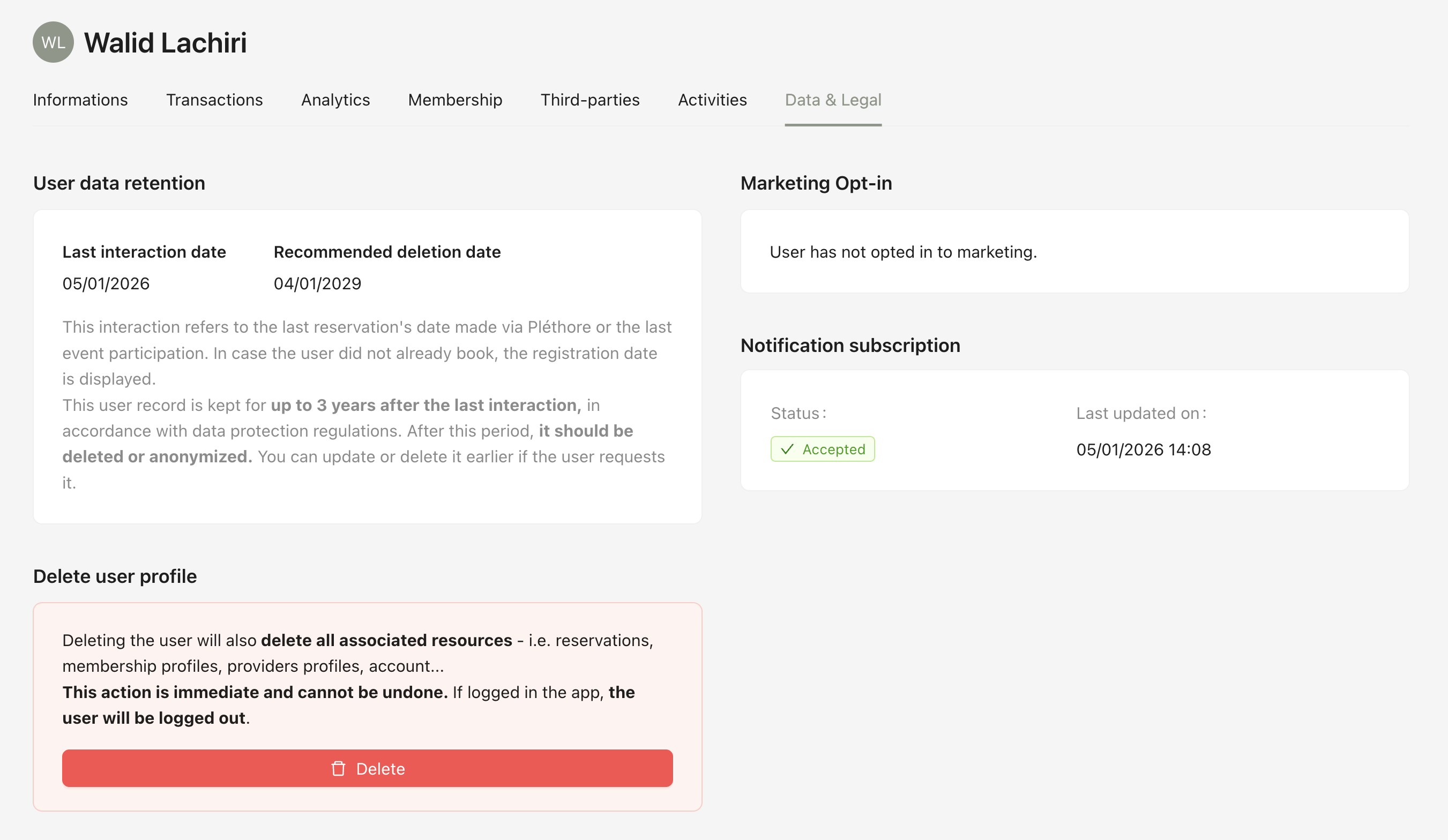 Provides access to legal and compliance-related information, including the option to delete the user account, marketing opt-in date, last user interaction, and notification subscription details.