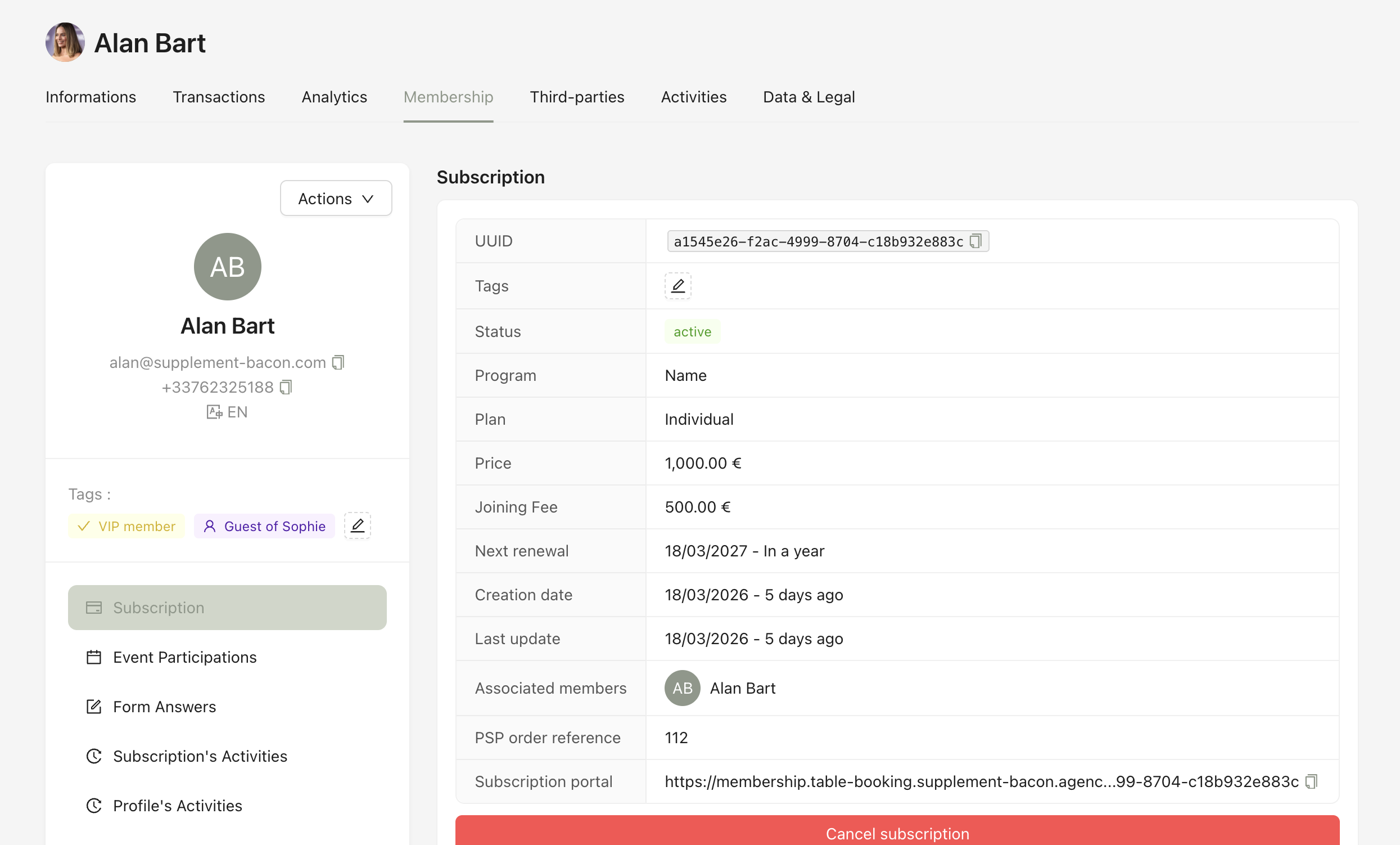 Contains all membership-related information, including subscription details, events, member tags, onboarding form answers, complementary items, subscription activity, and profile activity.