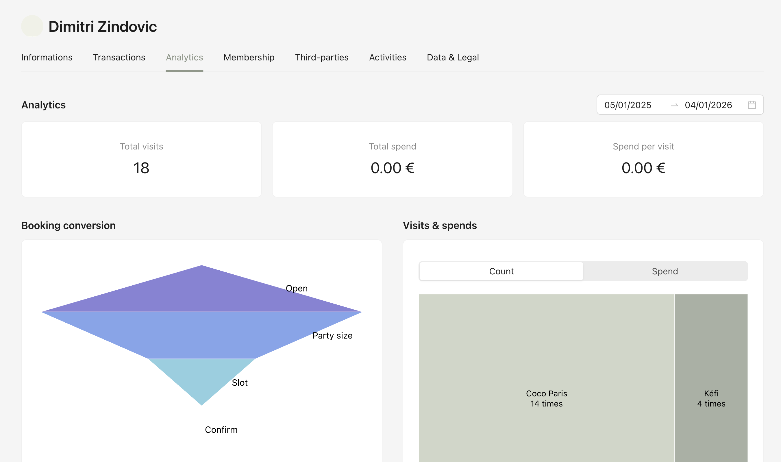 Shows analytics such as booking conversion, visits and spend, home availability searches, analytics events, and aggregated statistics (total visits, total spend, and spend per visit).