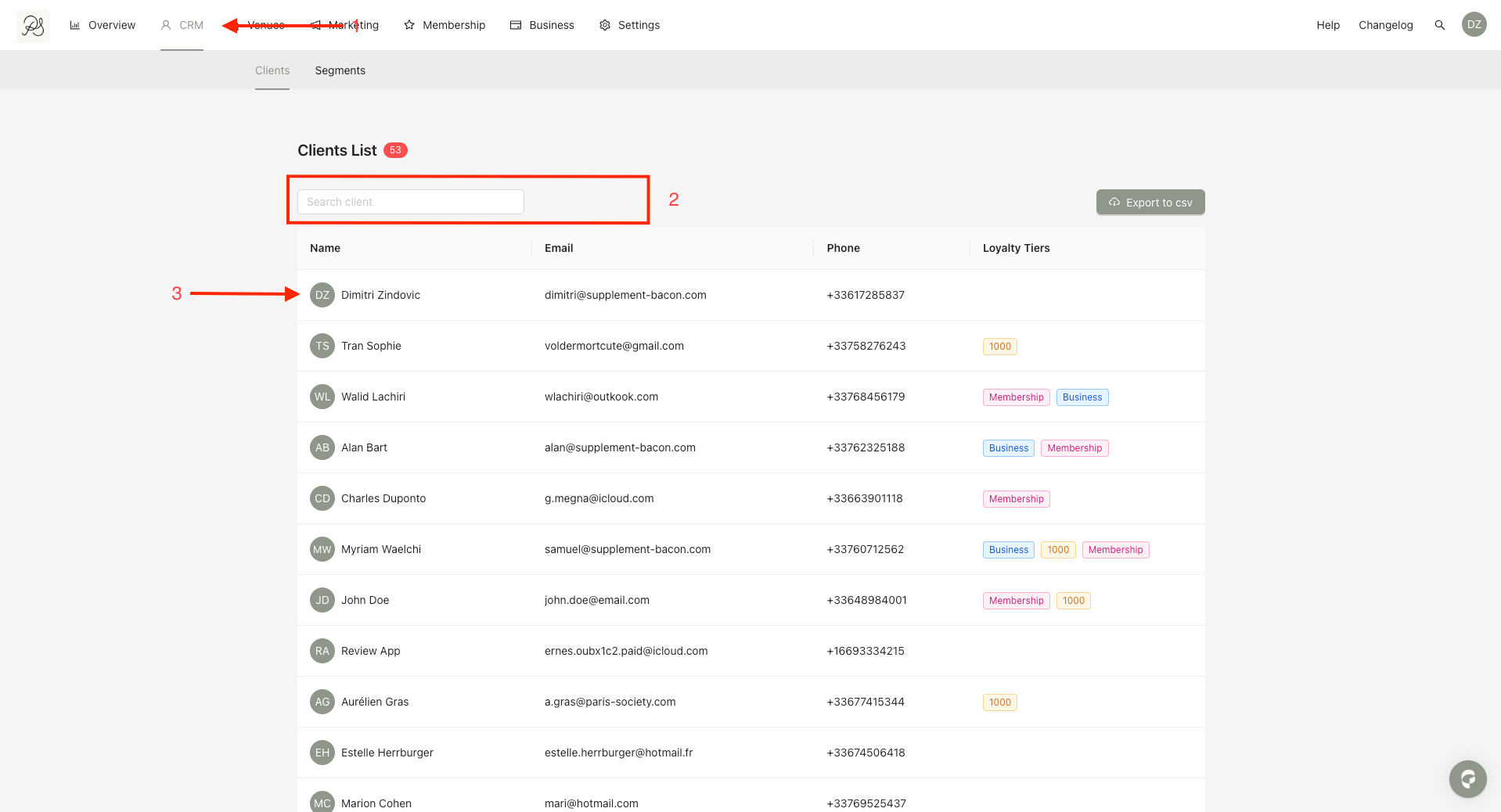 Step 2: Use the search and filter field to find users by: First name, Last name, Phone number, Email address (2).