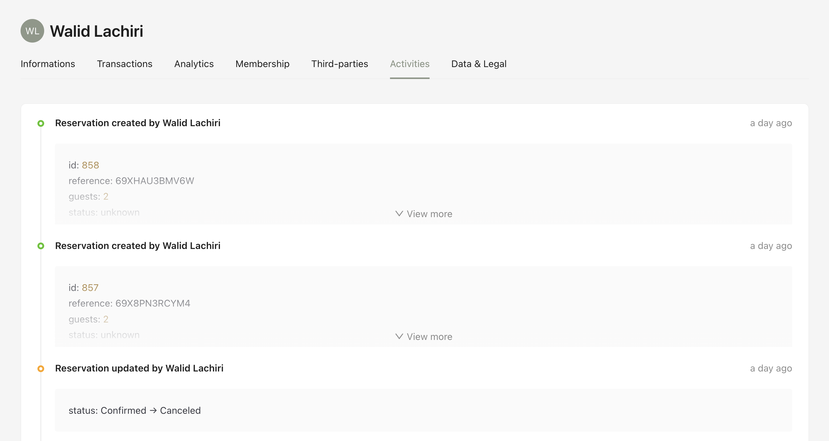 This section displays the activity history of a user, showing all actions performed on their account, such as reservations created, updated, or canceled, along with timestamps and key details for each event.