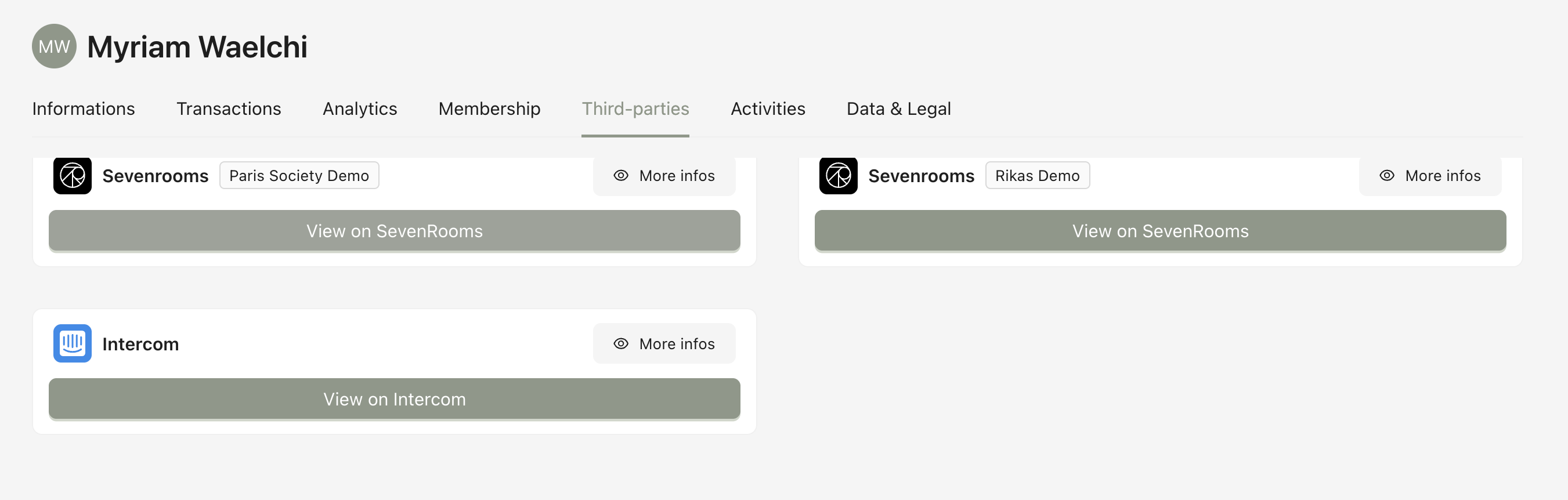 Lists all third-party services connected to the user via the mobile application (e.g. SevenRooms, Intercom).