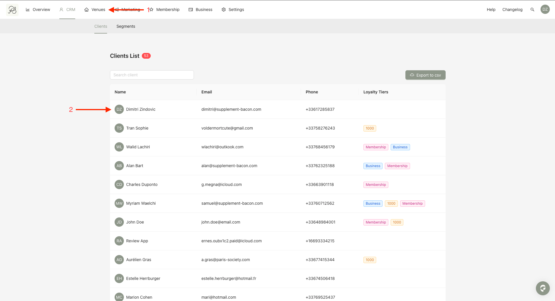 Step 1: From the homepage, click CRM (1). Select the user you want to view (2).