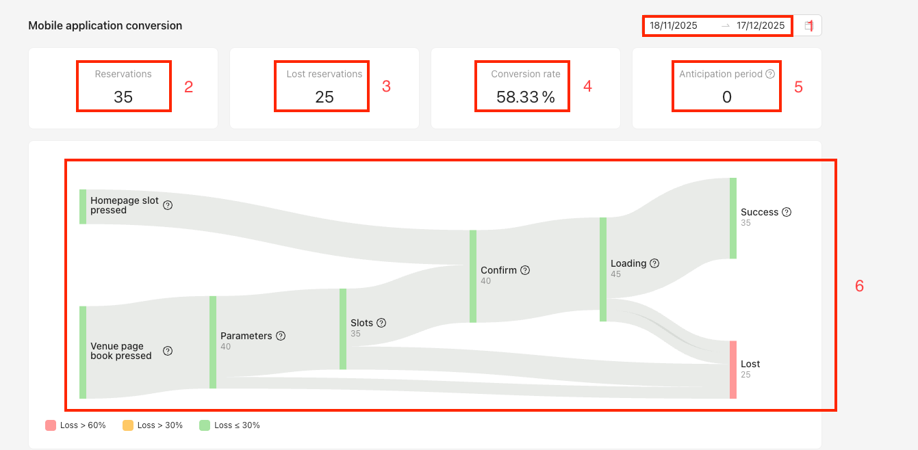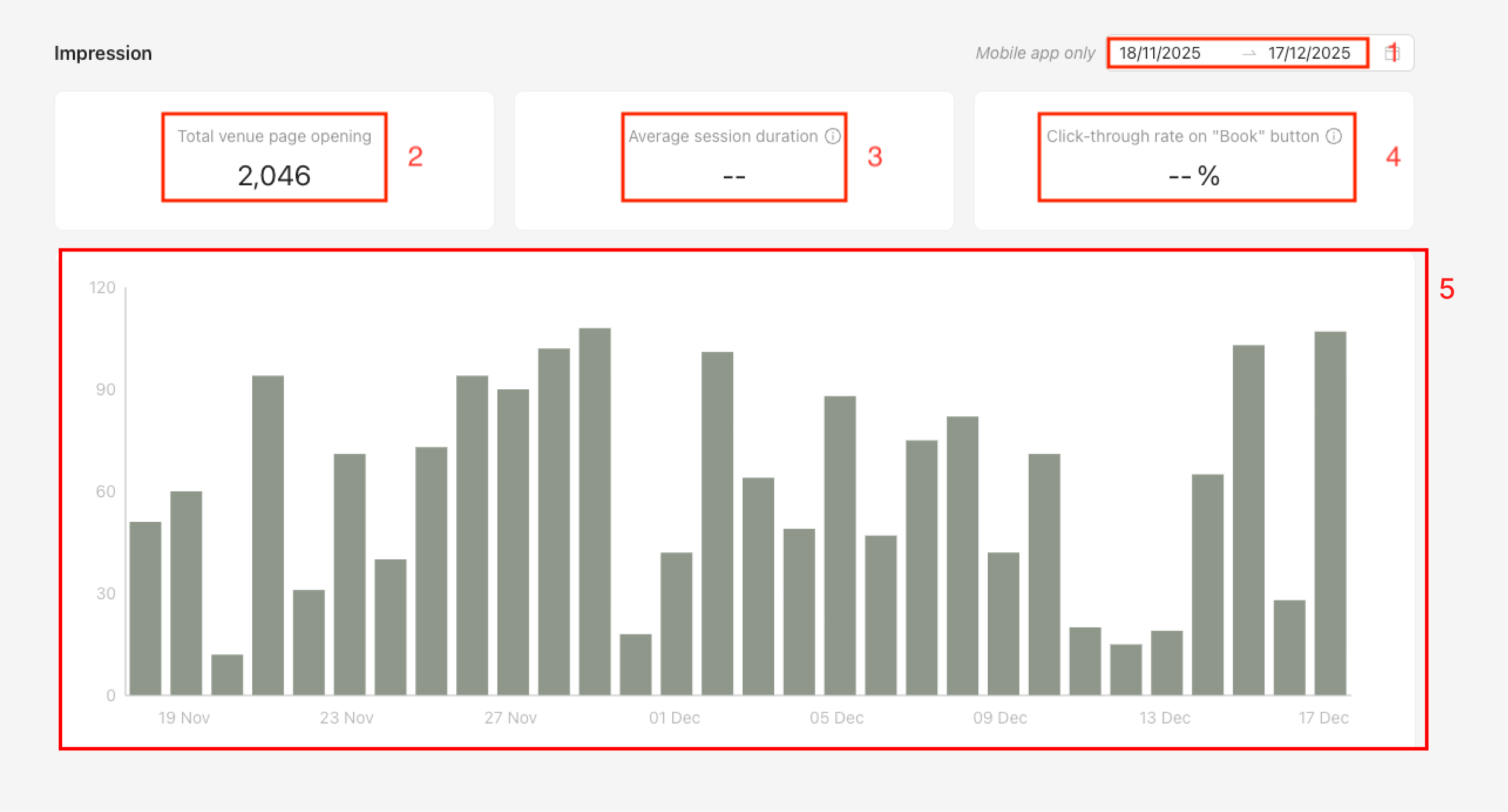 (5) This chart allows you to see the daily number of openings of the venue detail page in the mobile application. When hovering over a bar in the chart, you can view the exact number of openings for that day.