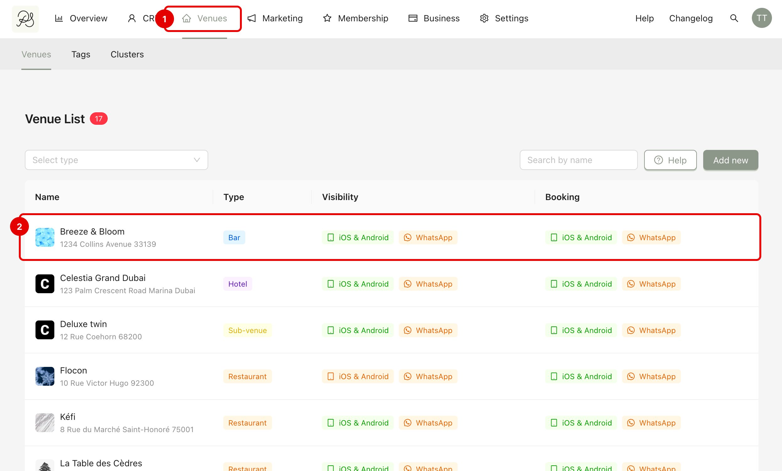 From the homepage, click Venues (1). Click on the venue you want to analyze (2).