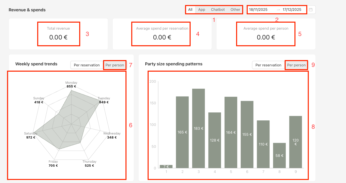 (8) Party size spending patterns: This chart shows the average amount spent based on the number of guests per booking. If you click Per person (9), the same chart is displayed but calculated per person instead of per booking.