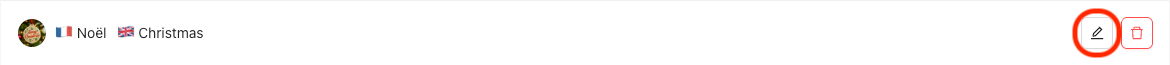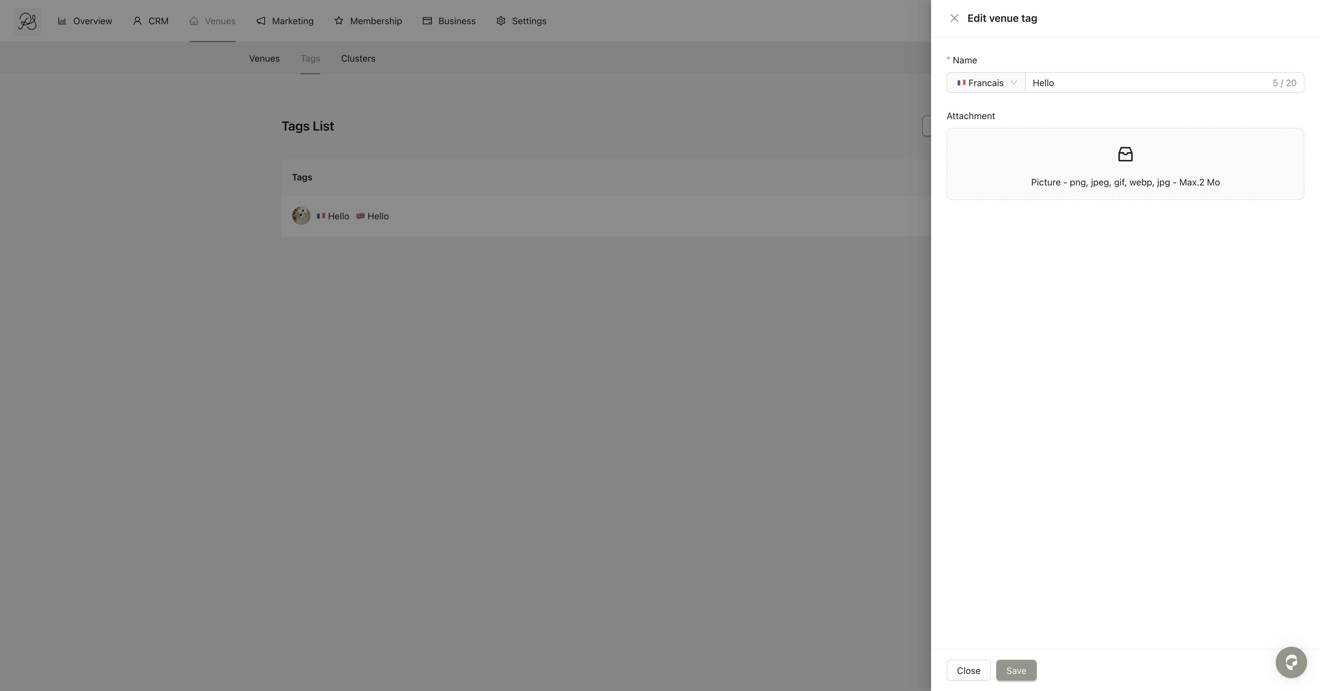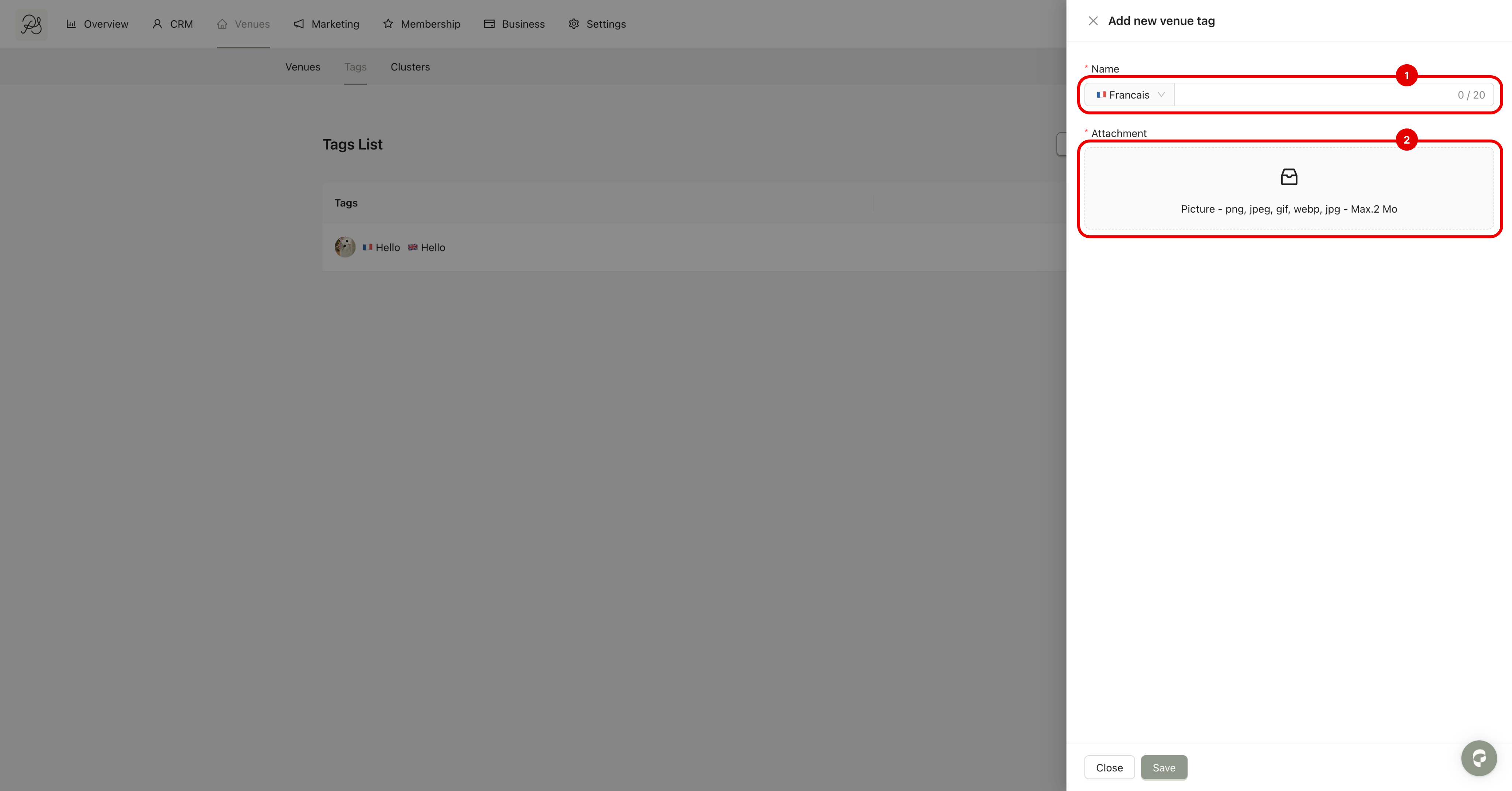 Step 2: Fill in the form the text of your tag in French and English (1). To add an icon, click inside the upload area or use drag and drop (2). Then click Save.